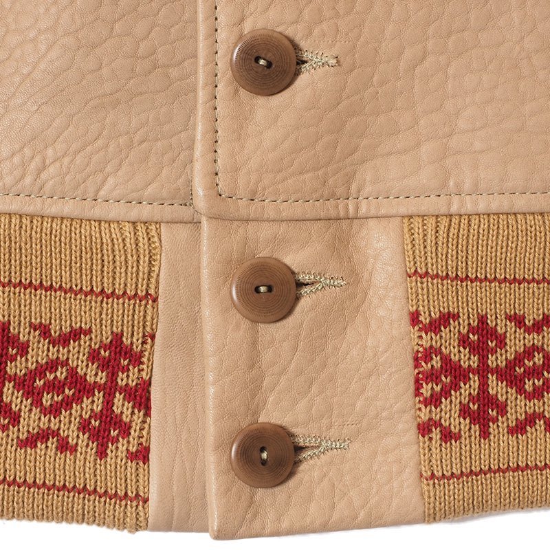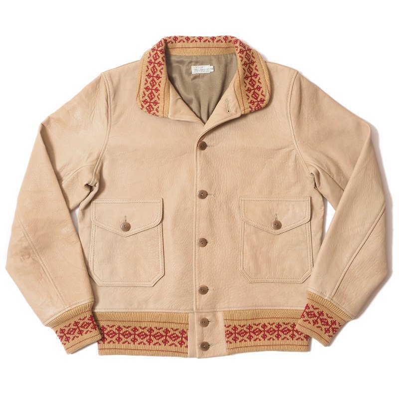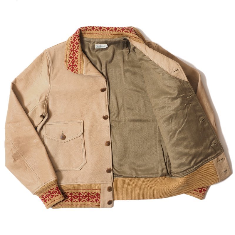 1920年代に米軍で正式採用される時代には、既に民生服としてあったA-1スタイルは、「コサック」や「ランバージャック」など、ターゲットに向けたネーミングで作られていました。リブが特徴的なこのモデルは実は革が秀逸。1920年代頃にケープレザーと呼ばれていた粗野な,シボの強いレザーを、ニュージーランド産ラムレザーで再現しています。リブはジャガードで編みたてたオリジナルで、無地のリブから比べても、ネイティブな風合いが高まります。さらには洒落たことに、トップのボタンホールはフラワーホールのような仕様で、開襟して着てもらうことを推奨しています。当時のカタログにはネクタイをした上からこのジャケットを着る姿もみられます。