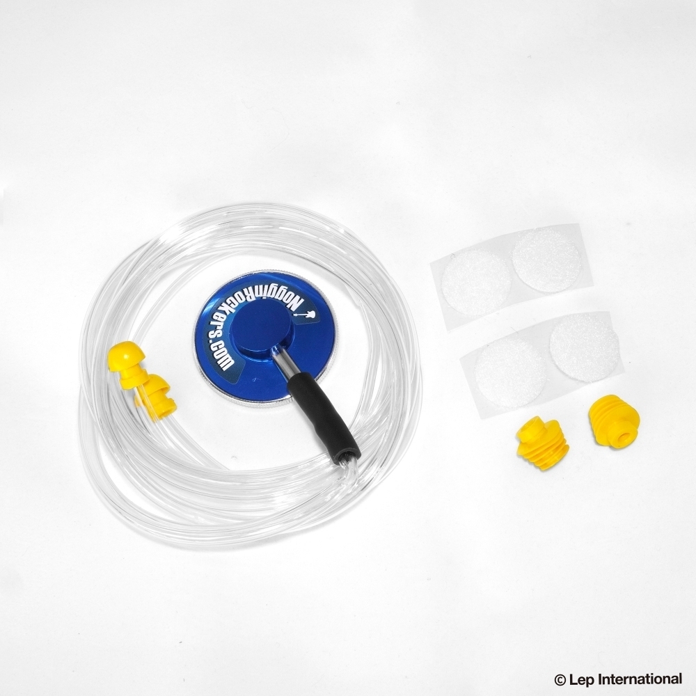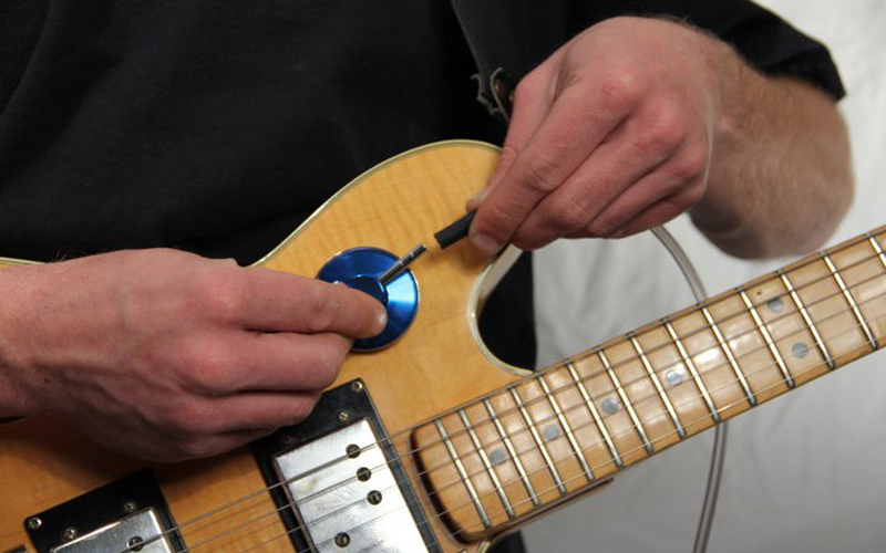 聴診器のように、ギター/ベースのボディやネックに取り付け、その振動を音として付属のイヤフォンを通して聴くことが出来ます。