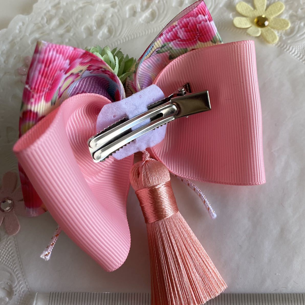 又、リボンの形状から、ヘアクリップ取り付け部分が上下にはみ出すようにお付けしています。着用時に支障が出ない程度に調整してお付けしていますが、感じ方には個人差がありますので、写真を参照の上気にならない方のみ入札をお願い致します。