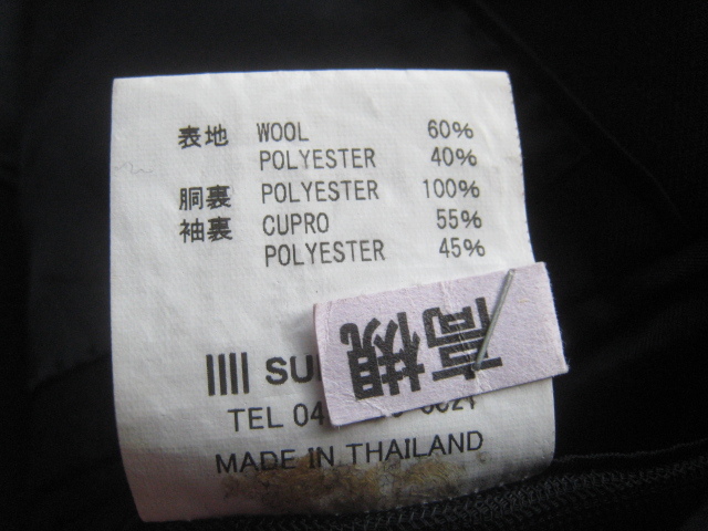 表地 ウール60%、ポリエステル40%、裏地 ポリエステル100%、袖裏地 キュプラ55%、ポリエステル45%