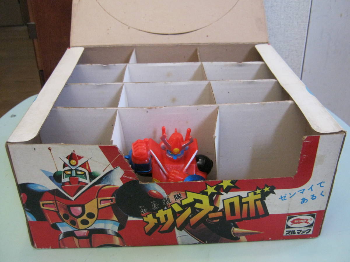 当時物です。未使用品です。ボックス販売(1箱に12個入りで店頭にて箱に入れた状態で販売)の為 専用の個々のタグ、袋、箱はありません。箱は付属しませんが参考の為に箱の写真を2枚ほど載せておきます。あくまでも(本体)合身戦隊メカンダーロボ 人形(ゼンマイ歩行)のみです。ご理解のほどよろしくお願い致します。本体の足部分(プラ製)以外ソフビ製です。本体の状態は汚れ、キズがあります。破損、欠品はありません。ゼンマイを巻き可動チェック致しました。ゼンマイを巻いて床に置くと本体の下の部分の左右の足を交互に前後に動かし歩行しました。本体サイズは約12㎝×8㎝×5.7㎝位です。本体の後の腰部分に丸の中にCの文字 和光プロ メカンダーロボ ブルマァク JAPAN の刻印があります。本体の腰左側にブレーンファミリーの印字とBFマークが印刷された。シールが貼ってあります。記載されているサイズは素人採寸の為参考サイズです。以上判るだけ書きましたが写真、質問等で判断お願い致します。落札後はノークレーム・ノーリターンでお願い致します。