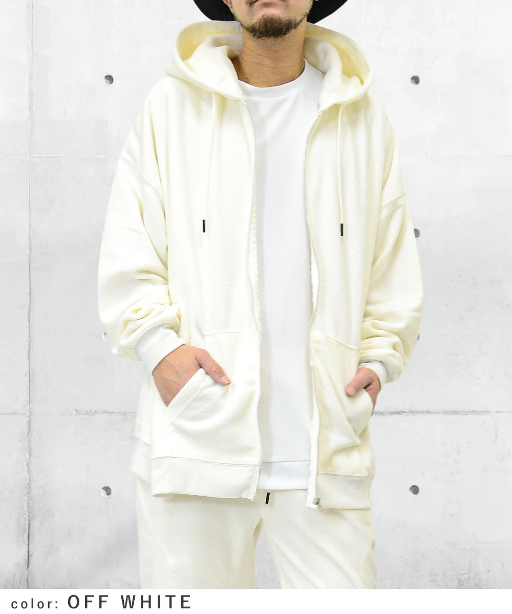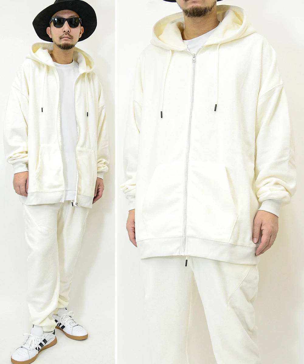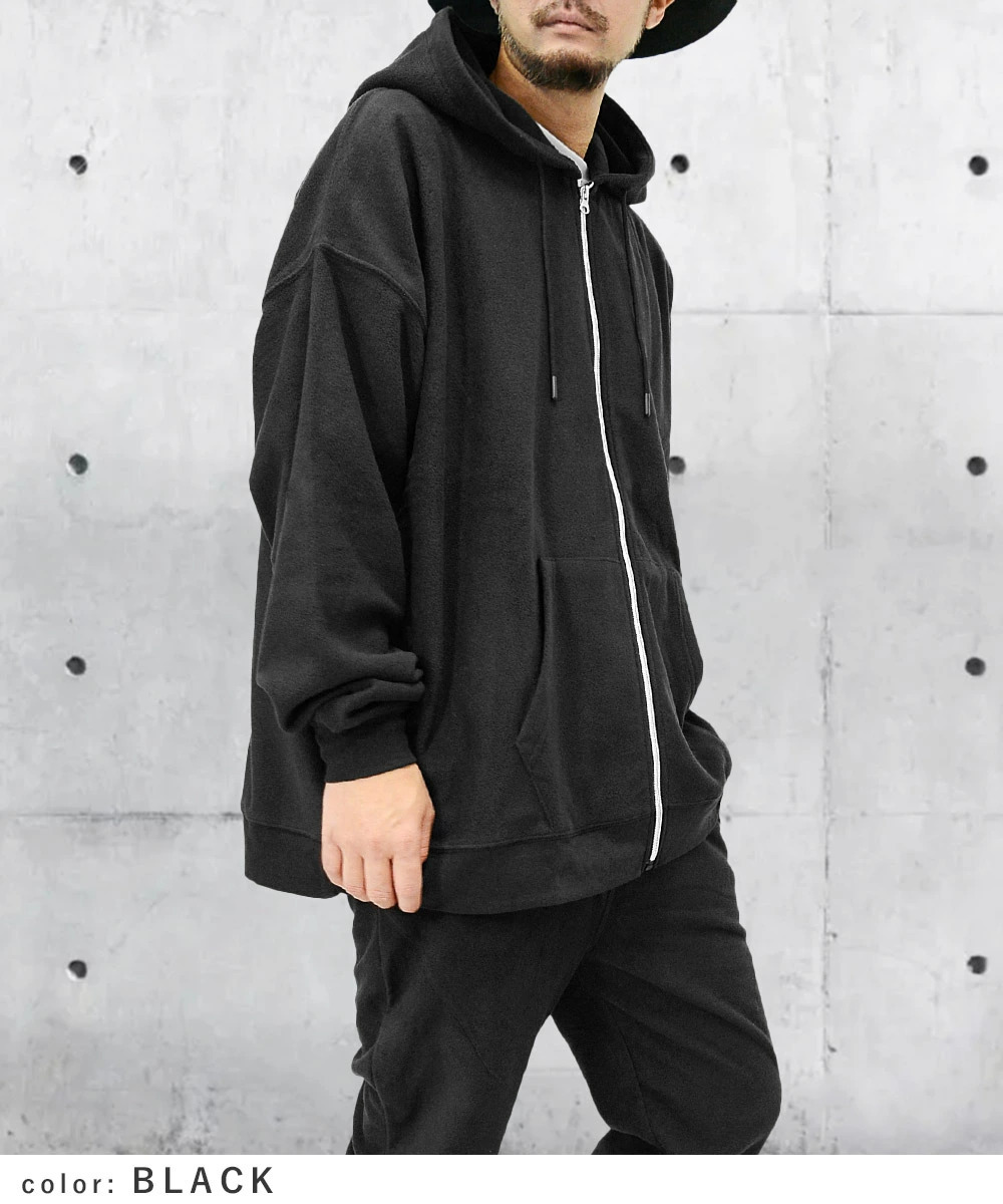 ドロップショルダーのビッグシルエットで演出するジップアップパーカー。