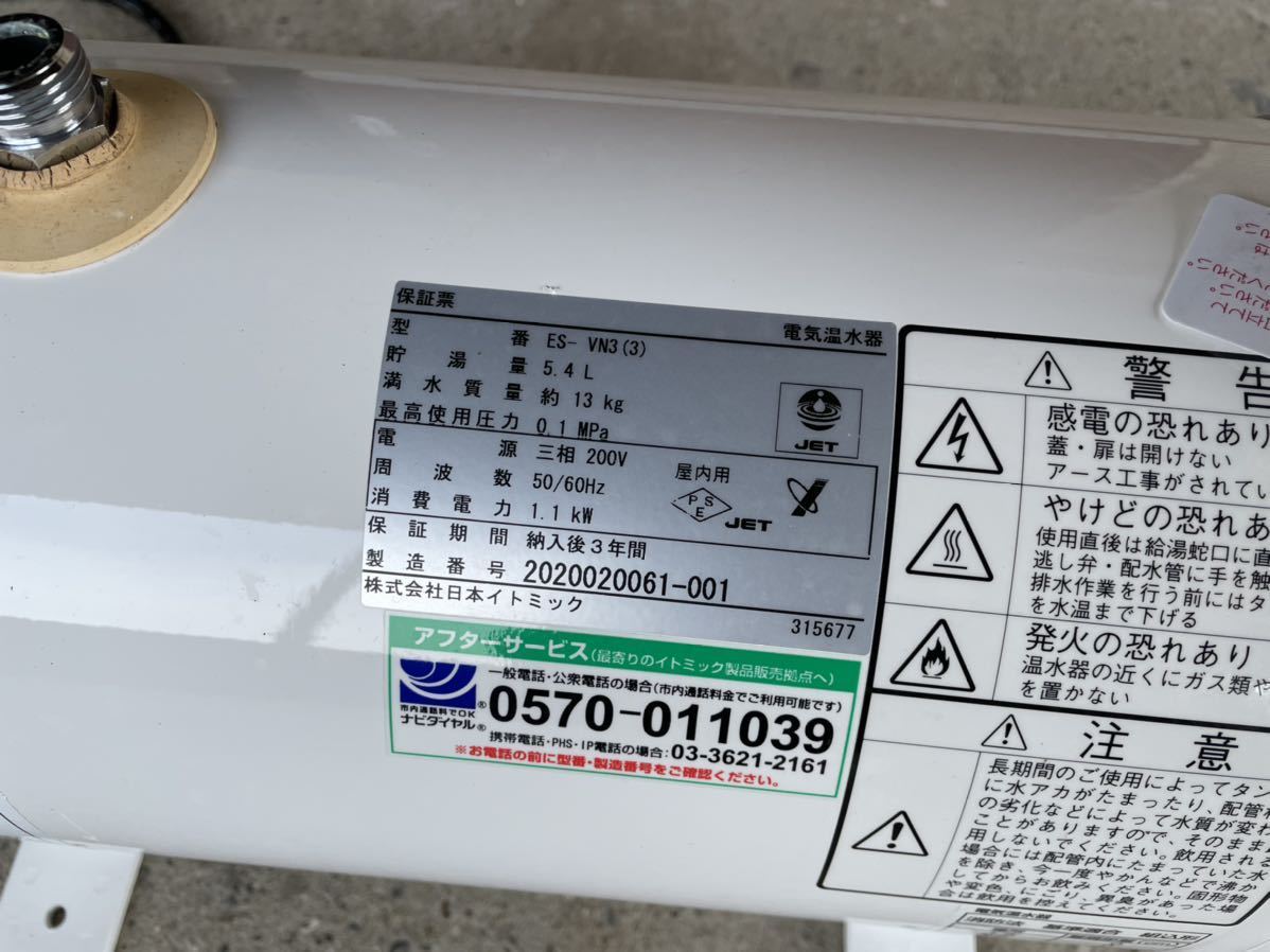 ★税込送料無料★ イトミック 美品 電気温水器 温水機 シンク下 ES-VN3 5.4L 3相200V 厨房機器 温水器 小型温水器