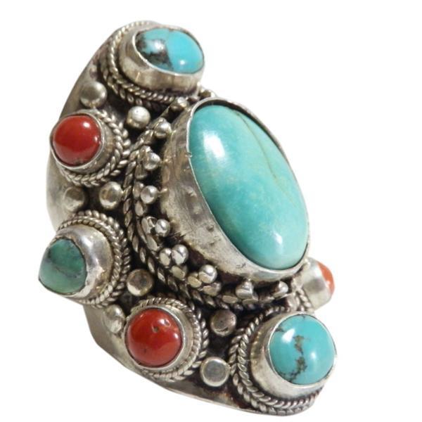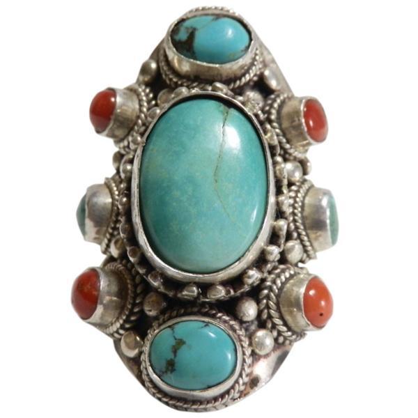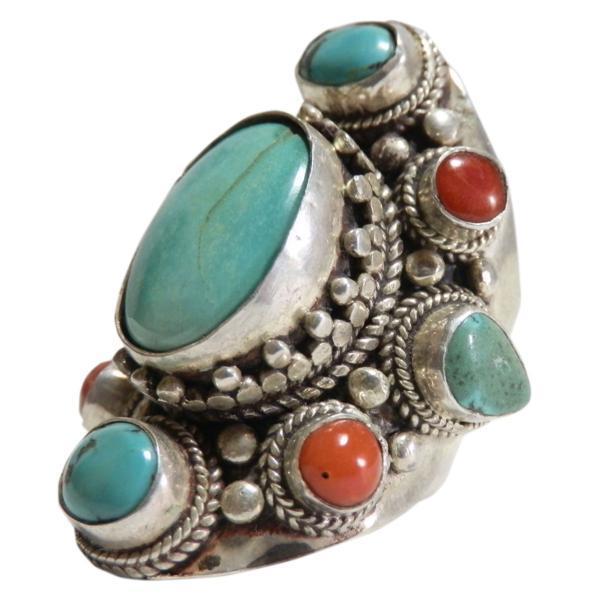 ■☆アジアン雑貨 ネパール 天然石メタルリング トルコ石・山サンゴ(CBR-1)