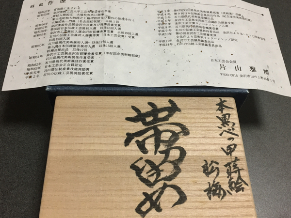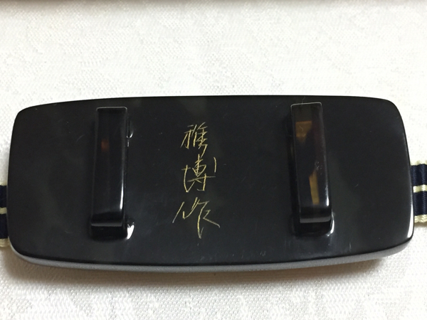 アンティークの黒甲の本鼈甲を使用し、金蒔絵を施した、【松梅】の帯留めです。片山雅博作、共箱、作歴付属。鼈甲部分に欠けや虫食いは無く、美品です。 縦2.2cm、横5.0cm、重さ8.8g