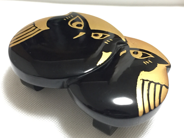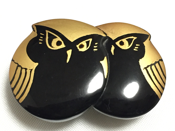 アンティークの黒甲の本鼈甲を使用し、漆塗り、金蒔絵を施した、梟デザインの帯留めです。鼈甲部分に欠けや虫食いはありません。 縦2.6cm、横3.8cm、重さ5.8g