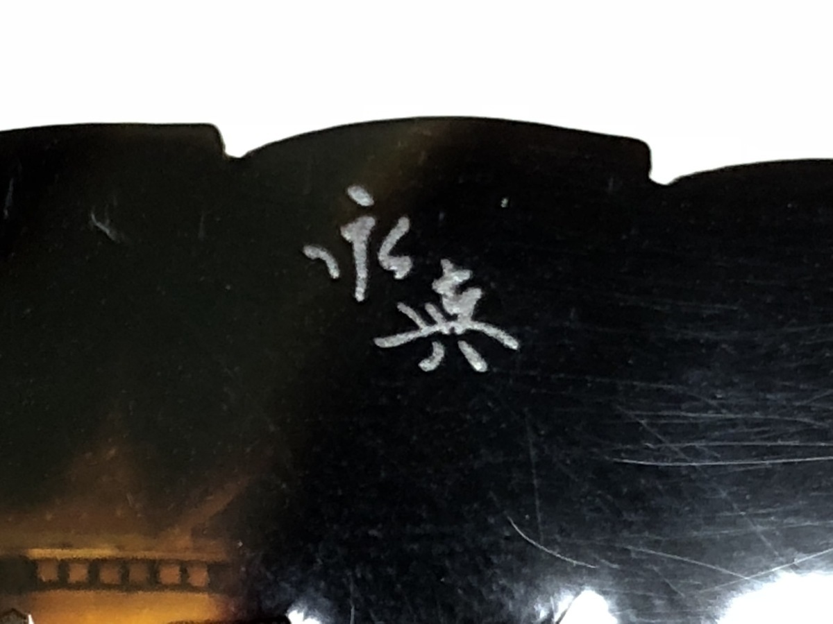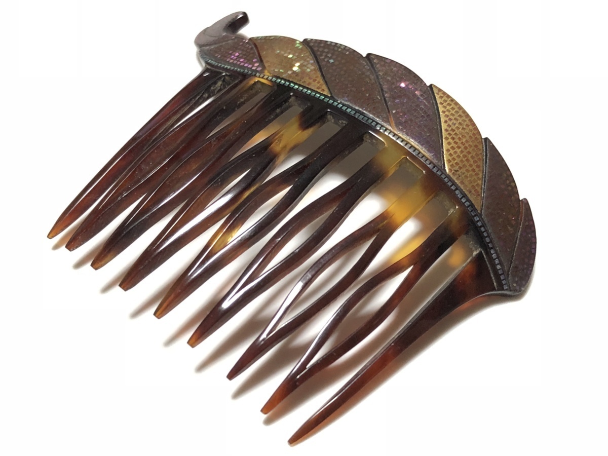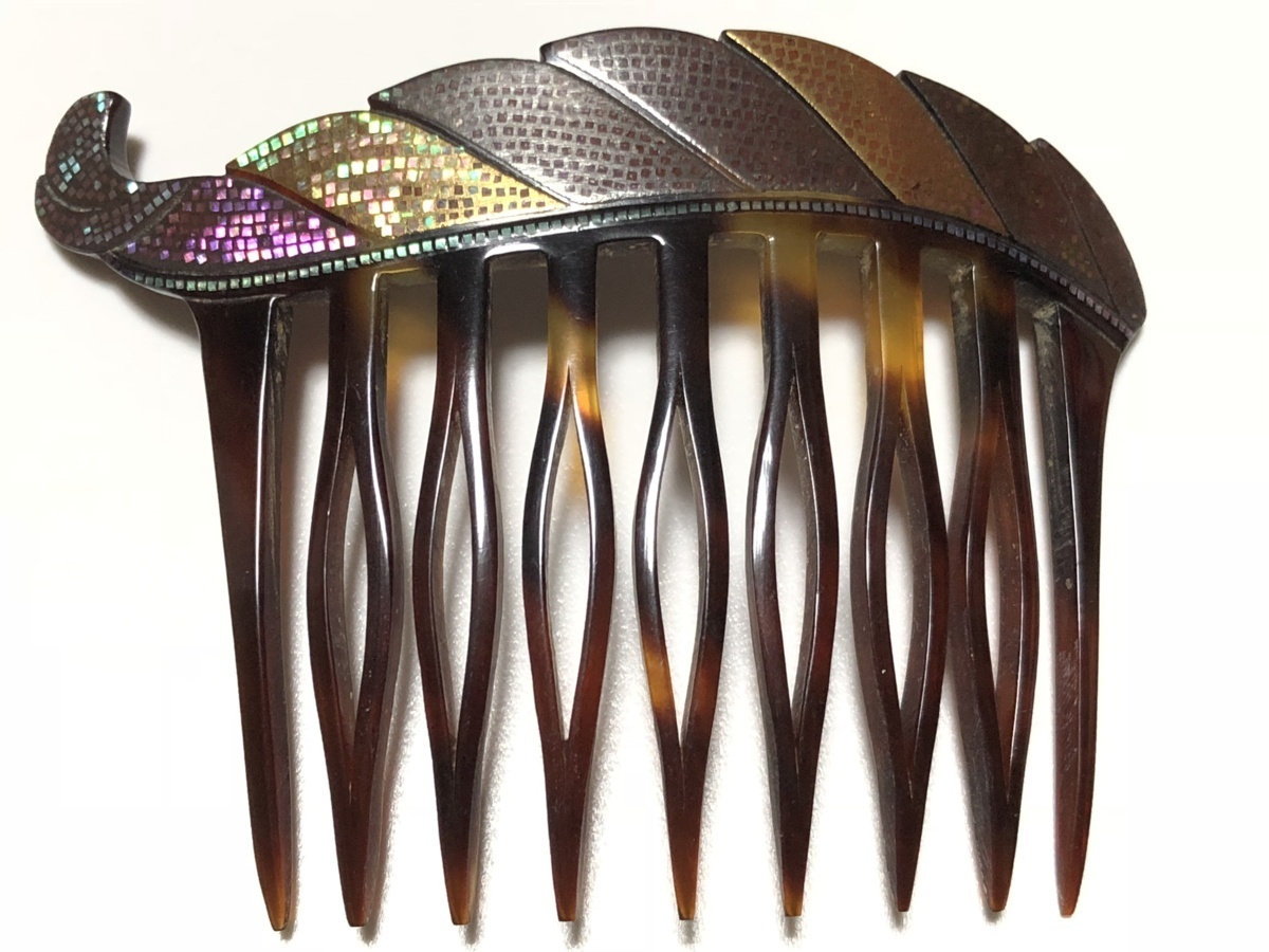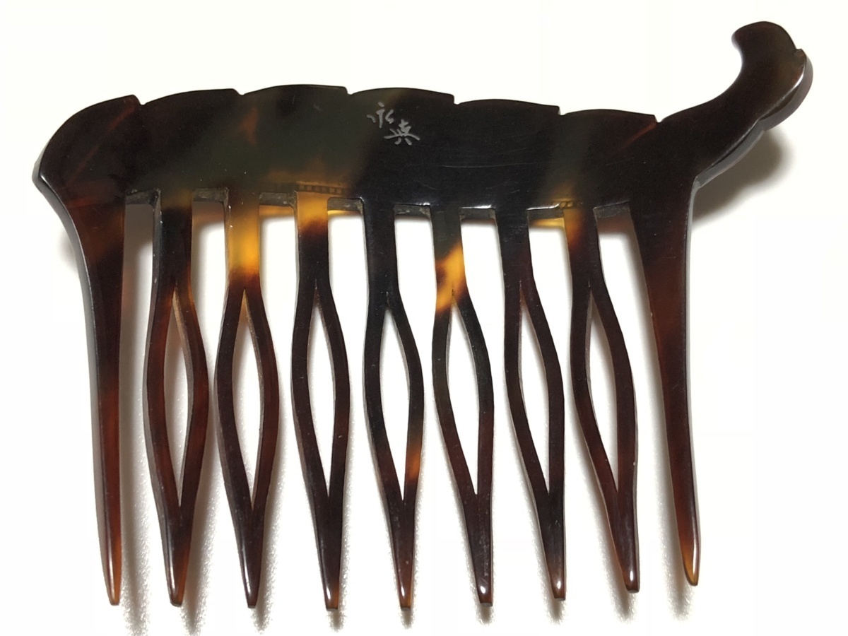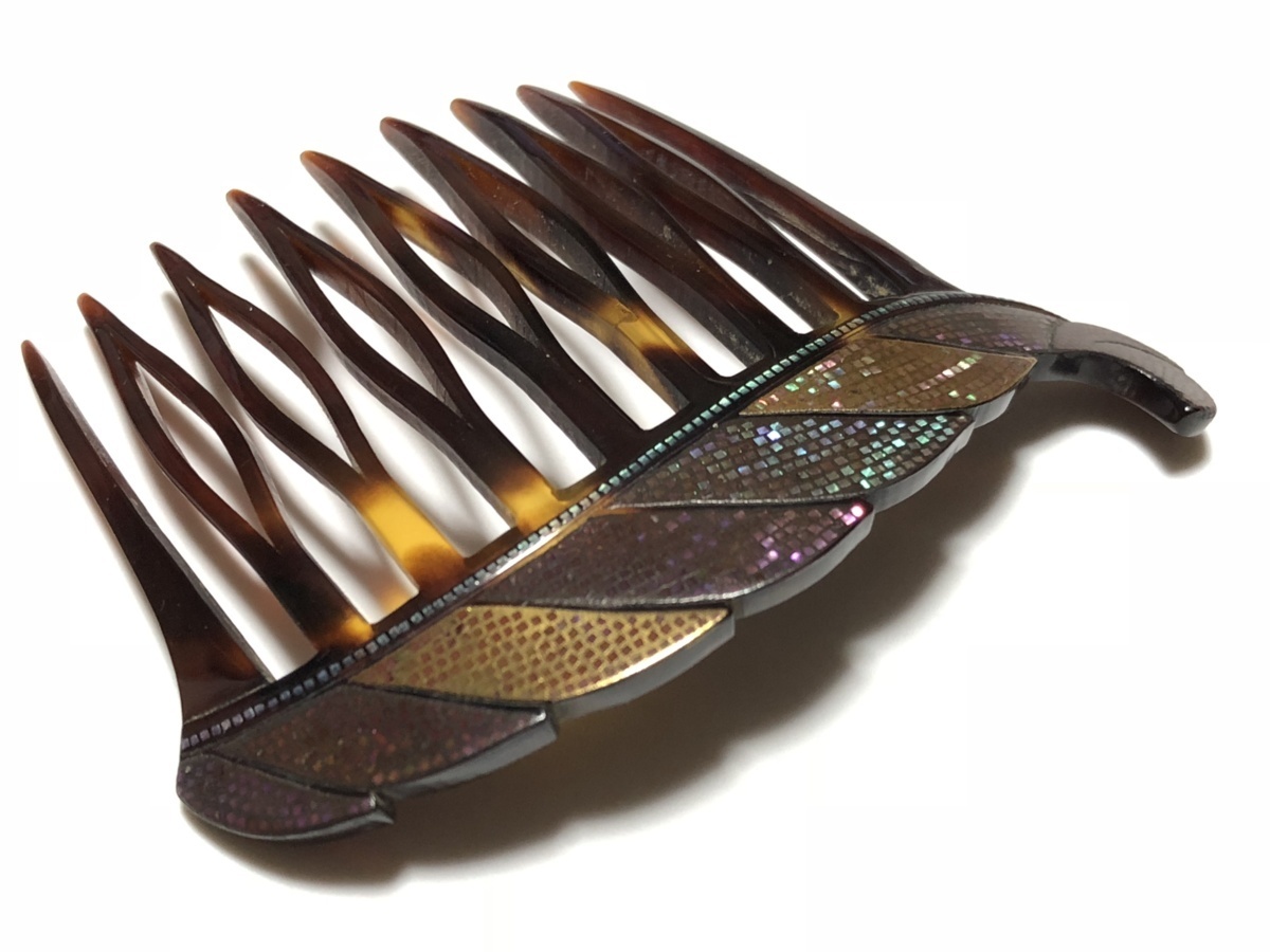 アンティークの本鼈甲を使用した、金蒔絵、螺鈿を施した、デザイン櫛です。作者、永英の銘があります。鼈甲部分に欠けや虫食いは無く、状態良好です。 縦5.4㎝、横7.3㎝、重さ5.8g