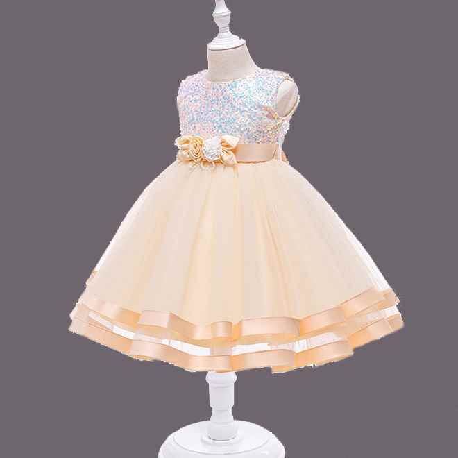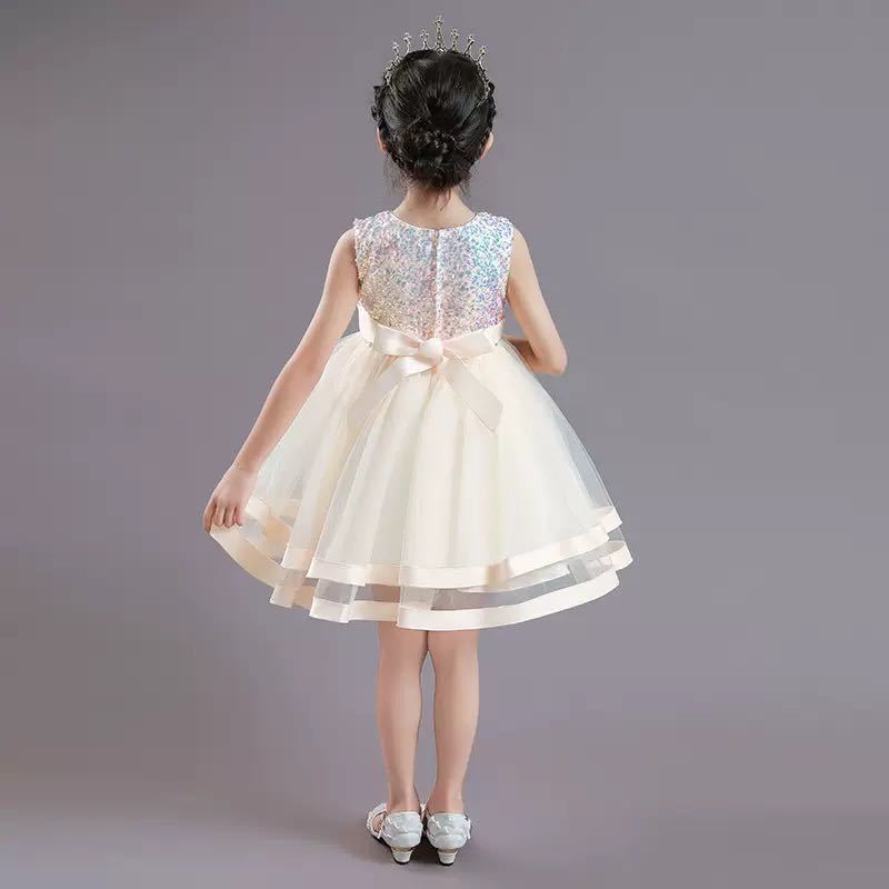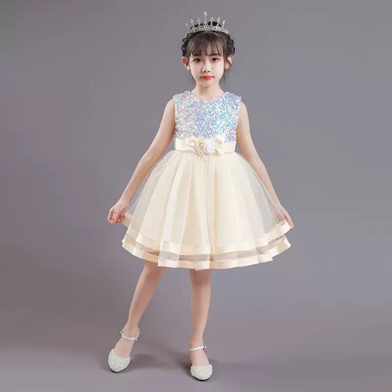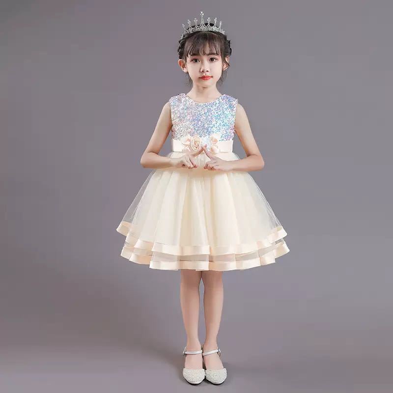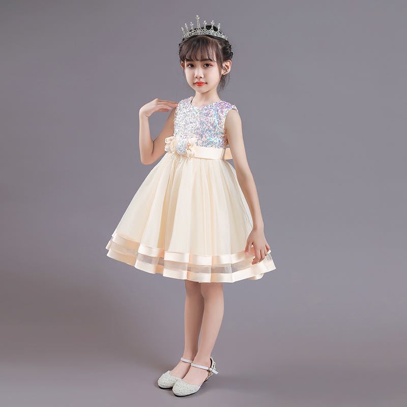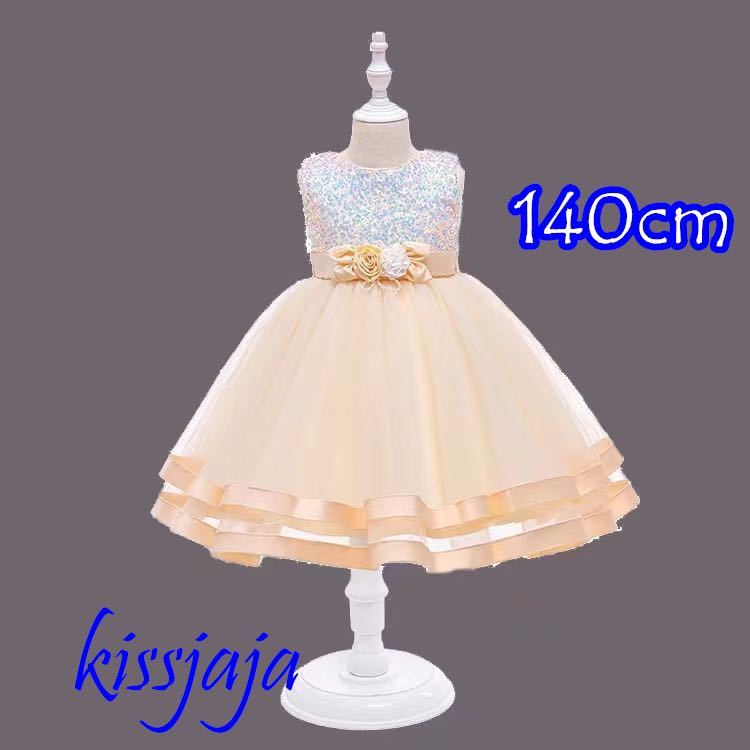 高級なベージュキラキラの膝上の丈になります。とてもふんわりのドレスです。結婚式、誕生日、七五三の他、バイオリン発表会、ピアノ発表会、演奏会などにもぴったりです。 【素材】ポリエステル