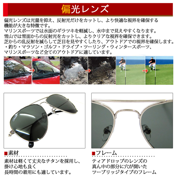 長年に渡り絶大な支持を受けている『ティアドロップサングラス』 ティアドロップのレンズの真ん中の部分に穴が開いたツーブリッジタイプのレアフレームです。 素材は軽くて丈夫なチタンを採用し、掛け心地も良く長時間の着用にも適しています。 どんなファッションにも合わせやすくユニセックスでお使い頂けるアイテムです。 オシャレを楽しむだけでなく、紫外線を99%カットしてくれるので、お出かけの際の紫外線対策としてもオススメです。 一切妥協せずファッション性、実用性を重視し、選び抜かれた素材でしあがったMaturiサングラスを是非体験して頂きたい。 【偏光レンズとは】 眩しさや反射光を、より効果的にカットできるレンズです。 偏光レンズは光量を抑え、反射光だけをカットし、より快適な視界を確保する機能が大きな特徴です。 マリンスポーツでは水面のギラツキを軽減し、水中まで見えやすくなります。 マラソン・釣り・ゴルフ・ツーリング・ウィンタースポーツなどに適しています。 ■カラー:レンズ/グリーン、テンプル/シルバー ■サイズ:(約)レンズ横5.6cm×縦4.8cm、フレーム幅(外側)13.7cm (実寸につき誤差はあらかじめご了承ください) ■素材:レンズ(紫外線UVカット約99%)、フレーム/チタン ■可視光線透過率:15% ■紫外線透過率:1.0%以下 ■付属品:専用ケース ■新品・未使用 ■定価27,800円 ※一部画像共通 ※ご覧のモニターやプラウザの設定、照明等により、画像と実物の色合いが、若干異なる場合が御座います。 ※製造上の過程により商品によっては細かな傷がある場合が御座います予めご了承下さいませ。 | |