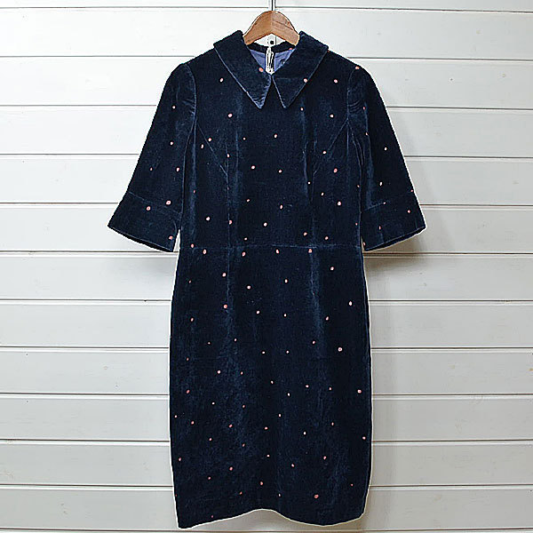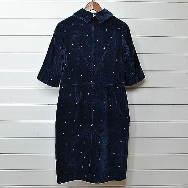 品番:ra3002。ベロアのような起毛したワンピースです。ポケットはありません。 ■付属品等:無し ■カラー:navy ■素材:コットン83%、ポリエステル17% 裏地:ポリエステル100% ■サイズ:38 ■寸法(cm、平置き測定):着丈100.5 身幅48 肩幅37.5 袖丈37 <採寸方法は下部に記載> ■商品状態:(B)古着(通常使用感程度の古着になります。)おなか付近に汚れがあり、首回りに薄汚れ、ヒップ、左袖、胸下に傷がございます。 ![]() 管理番号:20f1218 |
