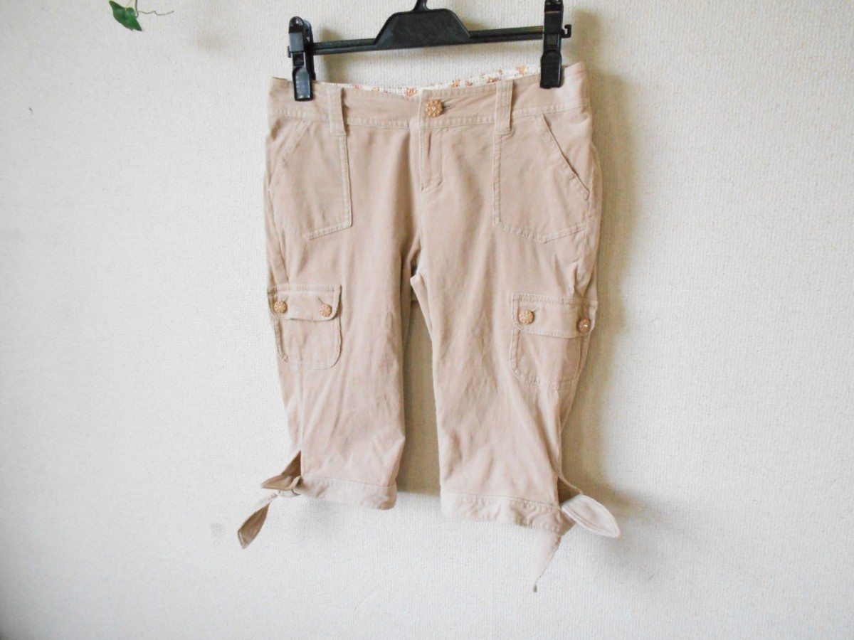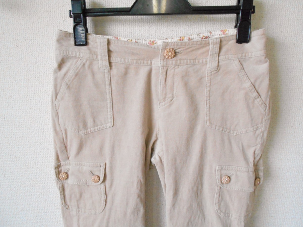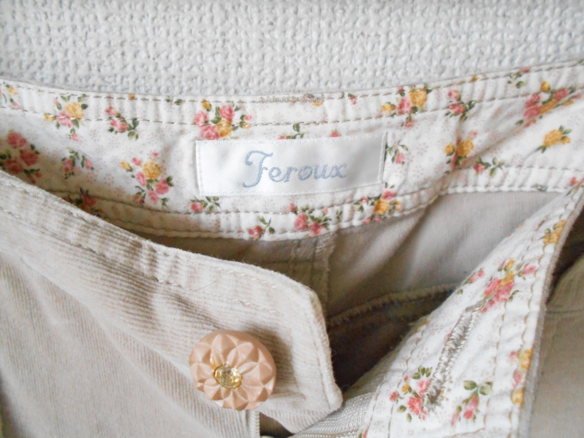 【ポイント】オンワード樫山、フェルゥのハーフ丈クロップドパンツになります。お色は薄いベージュ系で、細いコーデュロイ生地の秋冬向きです。キラキラの付いたボタンがとっても可愛い一着です。