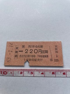 | (西)西日本会社線 東舞鶴→220円区間 東舞鶴駅発行 B型 硬券乗車券 S.62.&63 店番-硬券229 | |