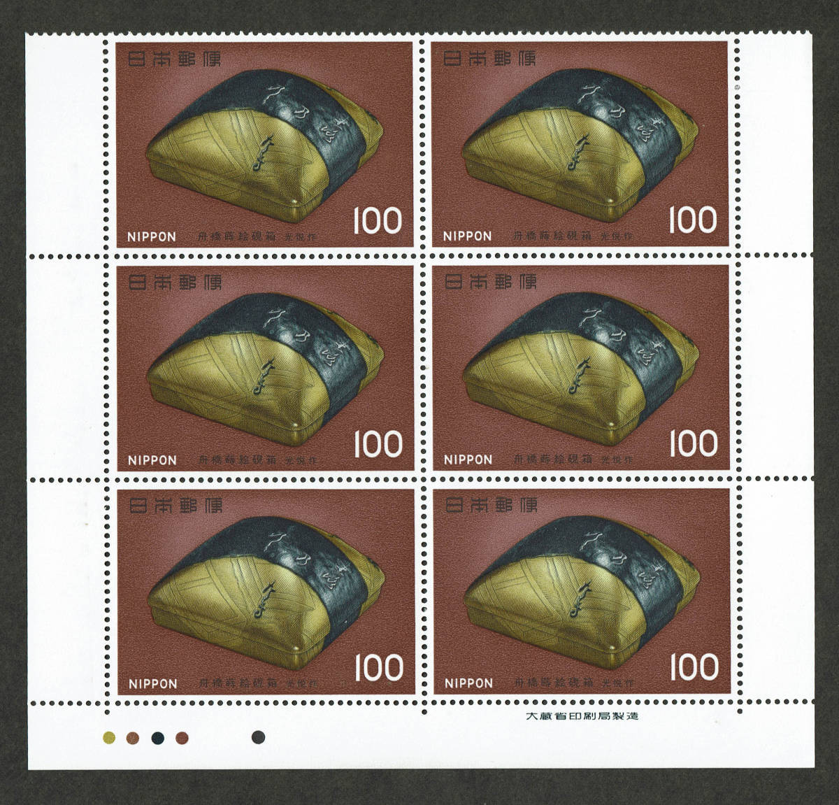 | 【未使用】 第2次国宝シリーズ 第7集 舟橋蒔絵硯箱(光悦作) 100円 100円×6枚 大蔵省印刷局銘版 切手 ♪ | |