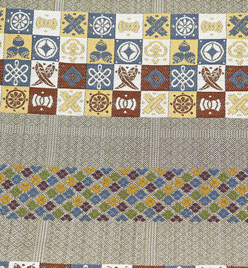 | 色・柄 | 西陣織袋帯 薄茶金地家紋格子菱文亀甲縞 (写真では上手く色が出ない場合があります。ご了承下さい) ※お使いのディスプレイの種類や設定の差により 実物の色と画像の色が少々異なることもございます。 写真の枚数が多いので一度パソコンでご覧ください。 |