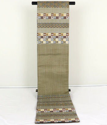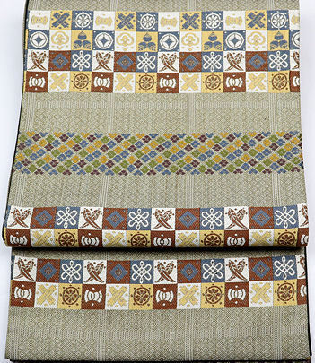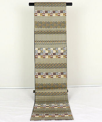 | 西陣織袋帯 薄茶金地家紋格子菱文亀甲縞 新品 仕立て上がり | |