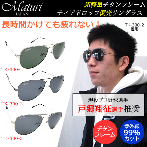 現役プロ野球選手 戸郷翔征選手 推奨! 長年に渡り絶大な支持を受けている『ティアドロップサングラス』 ティアドロップのレンズの真ん中の部分に穴が開いたツーブリッジタイプのレアフレームです。 素材は軽くて丈夫なチタンを採用し、掛け心地も良く長時間の着用にも適しています。 どんなファッションにも合わせやすくユニセックスでお使い頂けるアイテムです。 オシャレを楽しむだけでなく、紫外線を99%カットしてくれるので、お出かけの際の紫外線対策としてもオススメです。 一切妥協せずファッション性、実用性を重視し、選び抜かれた素材でしあがったMaturiサングラスを是非体験して頂きたい。 【偏光レンズとは】 眩しさや反射光を、より効果的にカットできるレンズです。 偏光レンズは光量を抑え、反射光だけをカットし、より快適な視界を確保する機能が大きな特徴です。 マリンスポーツでは水面のギラツキを軽減し、水中まで見えやすくなります。 マラソン・釣り・ゴルフ・ツーリング・ウィンタースポーツなどに適しています。 下記よりカラーをお選び下さい。 (落札時、オーダーフォームにてご希望カラーをお選び下さい。ご連絡を頂けない場合は当店で選択させて頂きます。) ■TK-300-1:レンズ/グリーン、テンプル/シルバー、可視光線透過率15% ■TK-300-2:レンズ/グレー、テンプル/ガンメタ、可視光線透過率15% ■TK-300-3:レンズ/グレーミラー、テンプル/シルバー、可視光線透過率10% ■サイズ:(約)レンズ横5.6cm×縦4.8cm、フレーム幅(外側)13.7cm (実寸につき誤差はあらかじめご了承ください) ■素材:レンズ(紫外線UVカット約99%)、フレーム/チタン ■紫外線透過率:1.0%以下 ■付属品:専用ケース ■新品・未使用 ■定価27,800円 ※ご覧のモニターやプラウザの設定、照明等により、画像と実物の色合いが、若干異なる場合が御座います。 ※製造上の過程により商品によっては細かな傷がある場合が御座います予めご了承下さいませ。 | |
