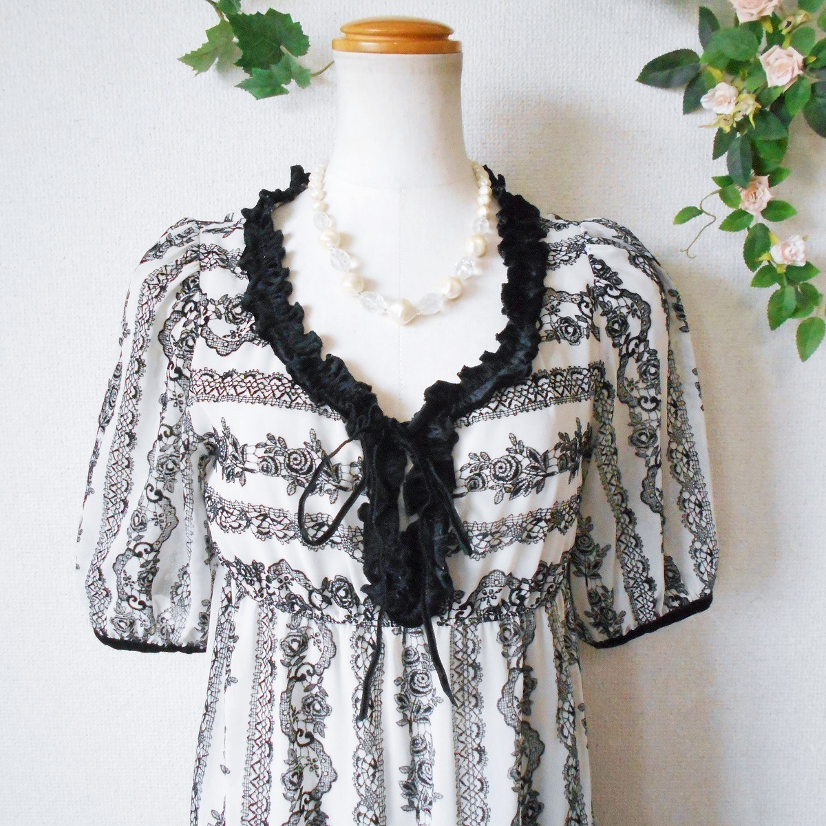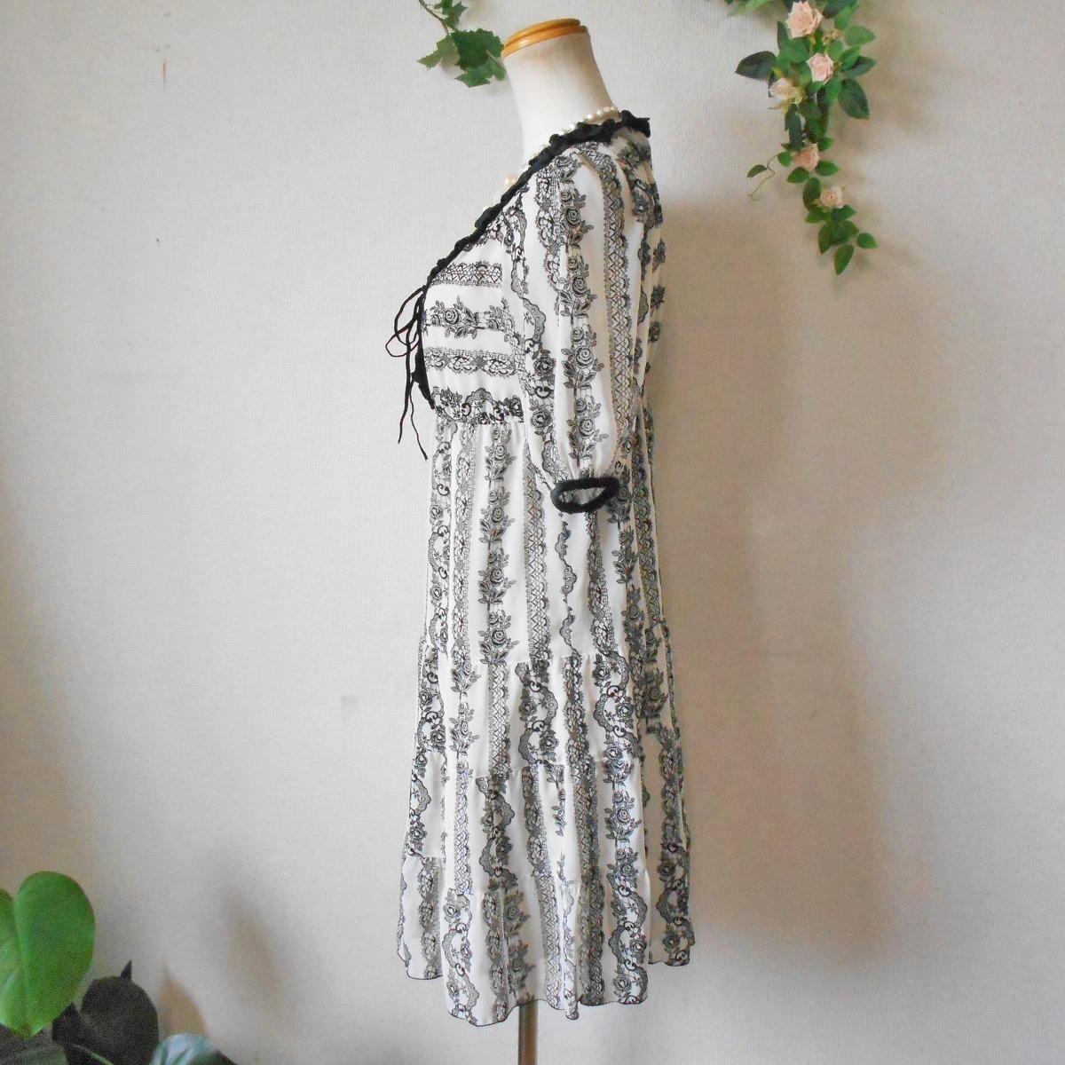 【ポイント】レストローズのワンピースになります。お色は透け感のあるキナリベースでストライプ状にフロッキーを使用した花柄等が入っています。