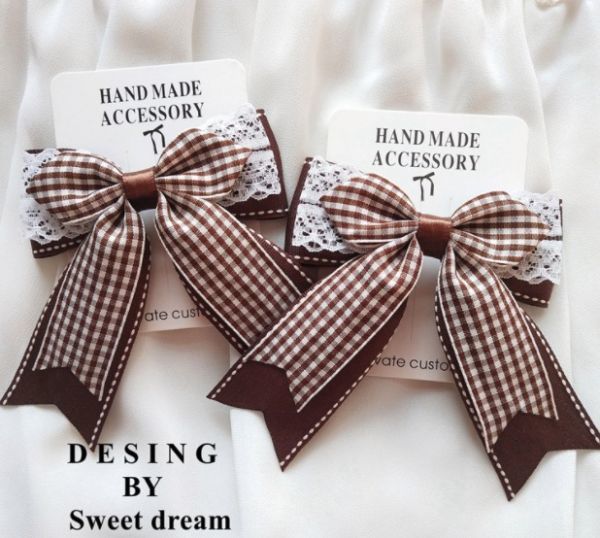 【新品・国内発送】ギンガムチェックとステッチのリボンヘアクリップ(コーヒー)2個セット 064025