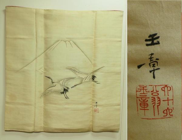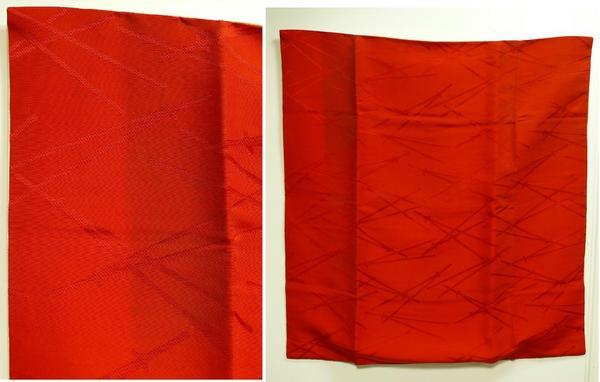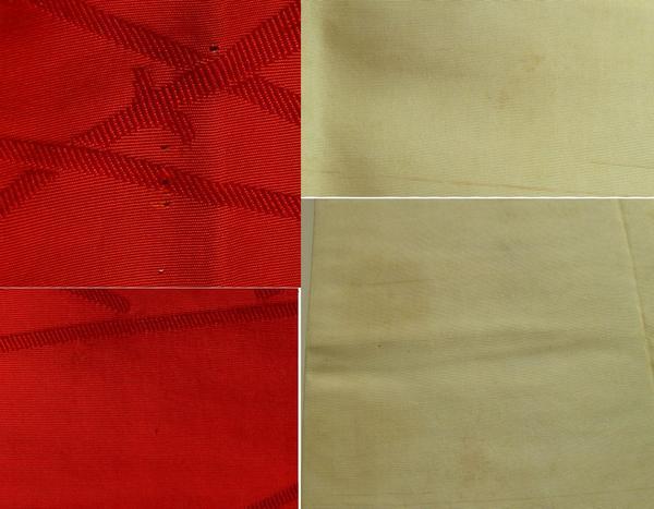 素材:正絹。サイズ67cm×64cm。全体に薄くやけがあります。表?(白地)写真のように左下に5cm×5cm・4.5cm×5cm・1.5cmの薄いしみがあります、中央より右上あたりに5mmほどの薄いしみあります、写真のように横線や薄やけが数か所あります。裏?(赤地)写真右中央あたりに小穴が5か所あります、左右それぞれ幅8cmほどやけがあります。
