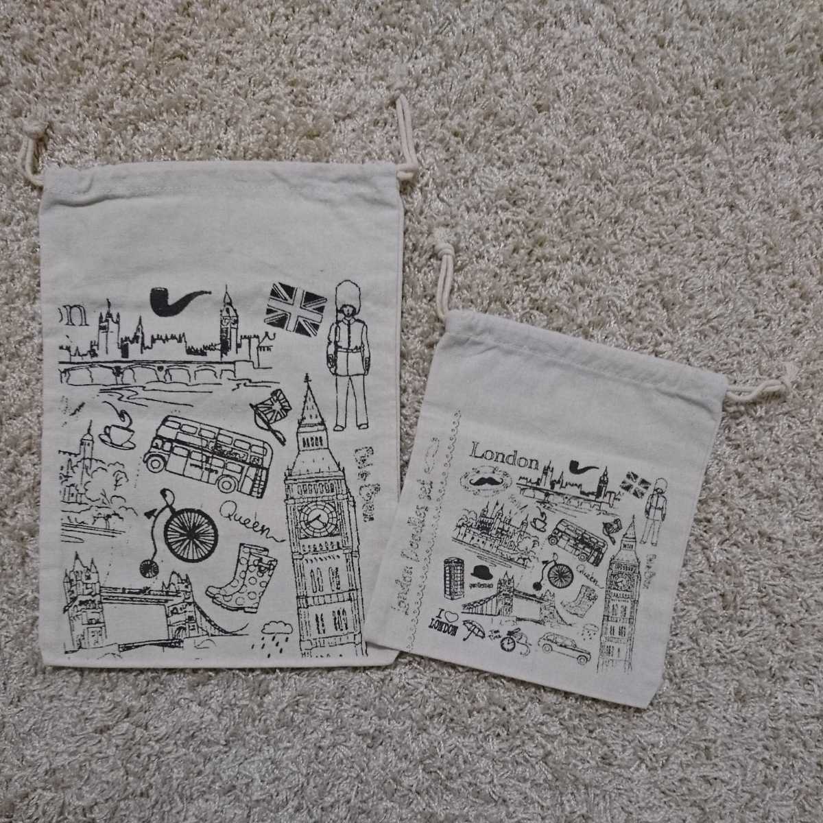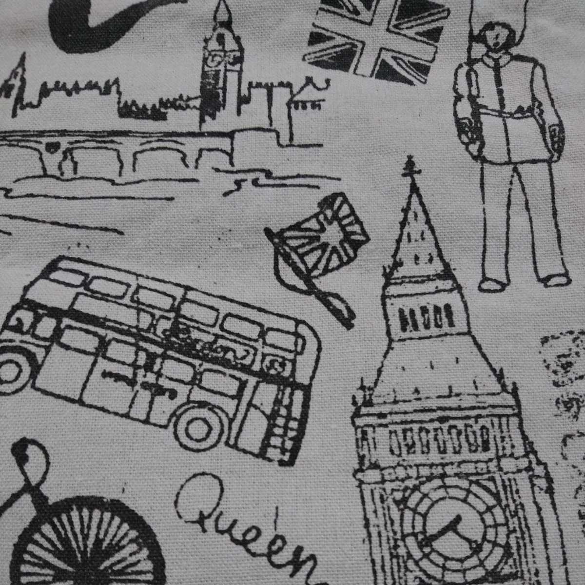イギリスを象徴する建物やロンドンのロゴなどが黒でプリントされ、大きさも2サイズあるので色々な用途にお使い頂けます♪