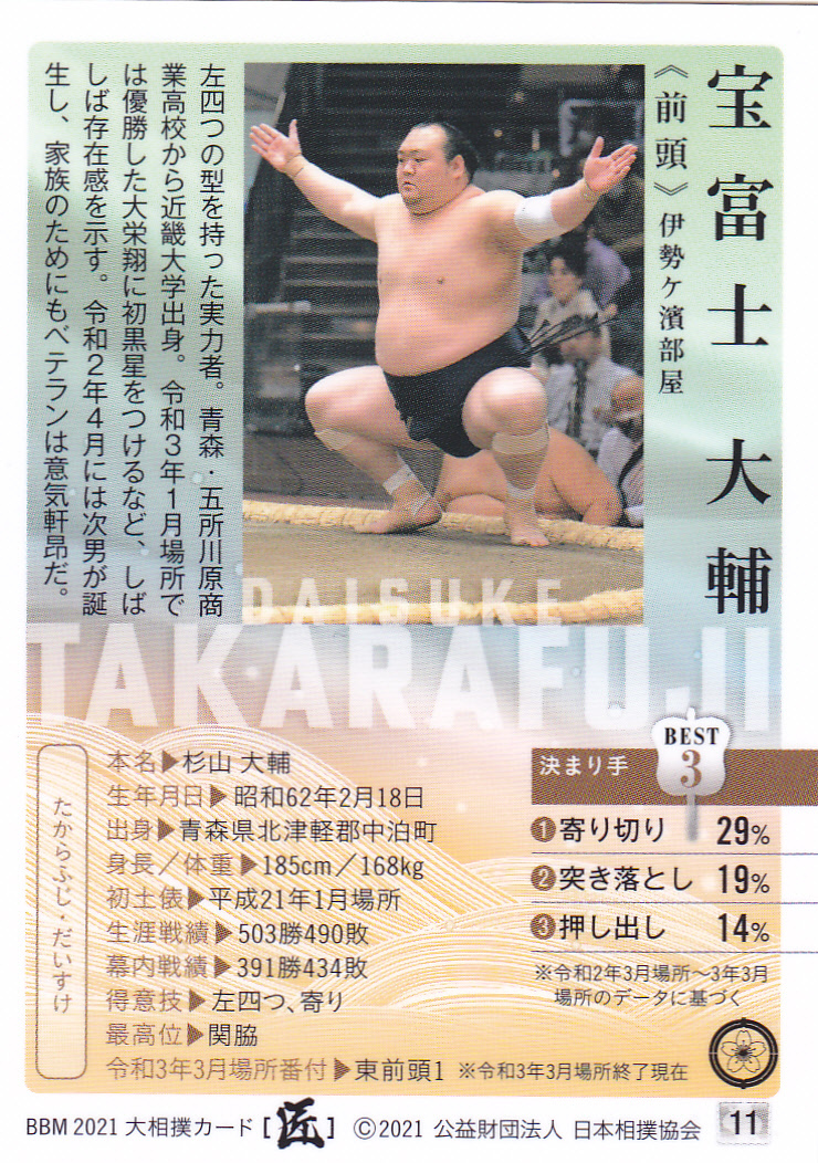 BBM2021大相撲カード 匠 11 宝富士 伊勢ケ濱部屋 青森県北津軽郡中泊町 五所川原商業高校 近畿大学 前頭