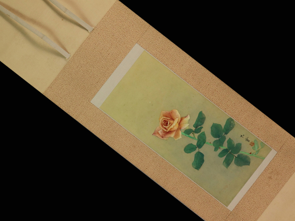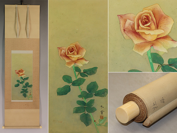 | №2110098【真作】山本紅雲【薔薇】◆絹本◆共箱◆二重箱◆太巻掛軸 | |