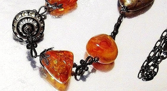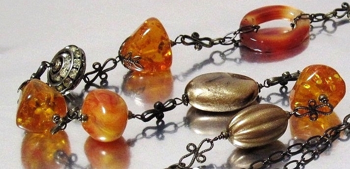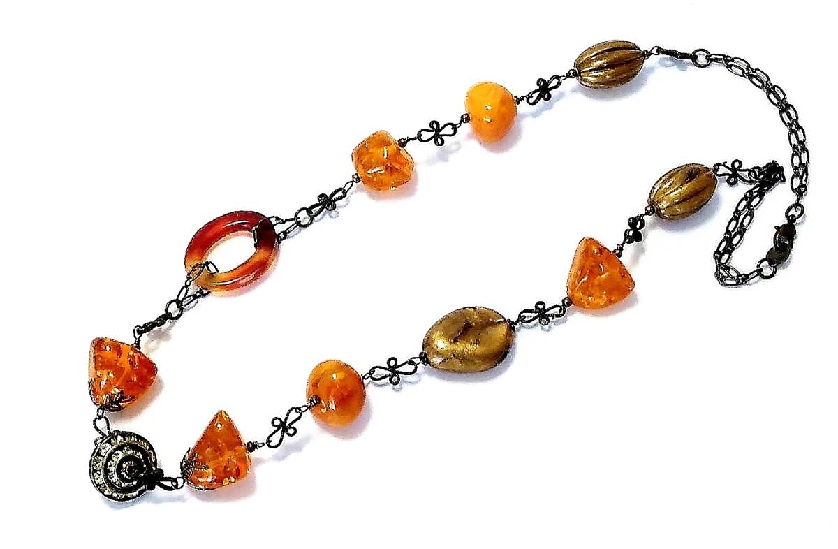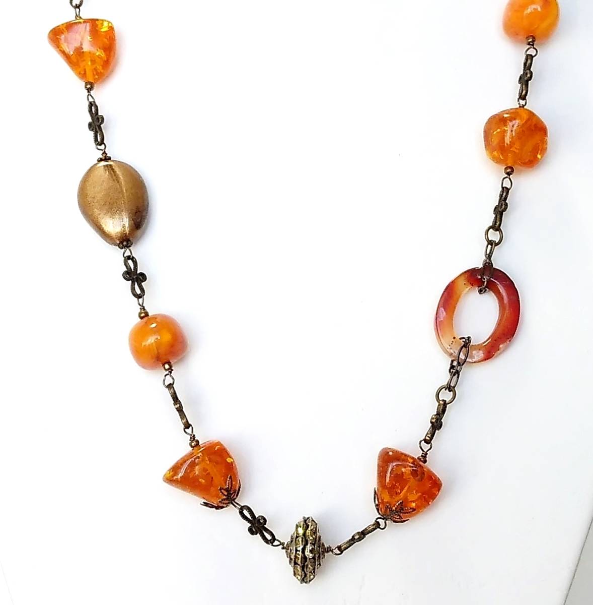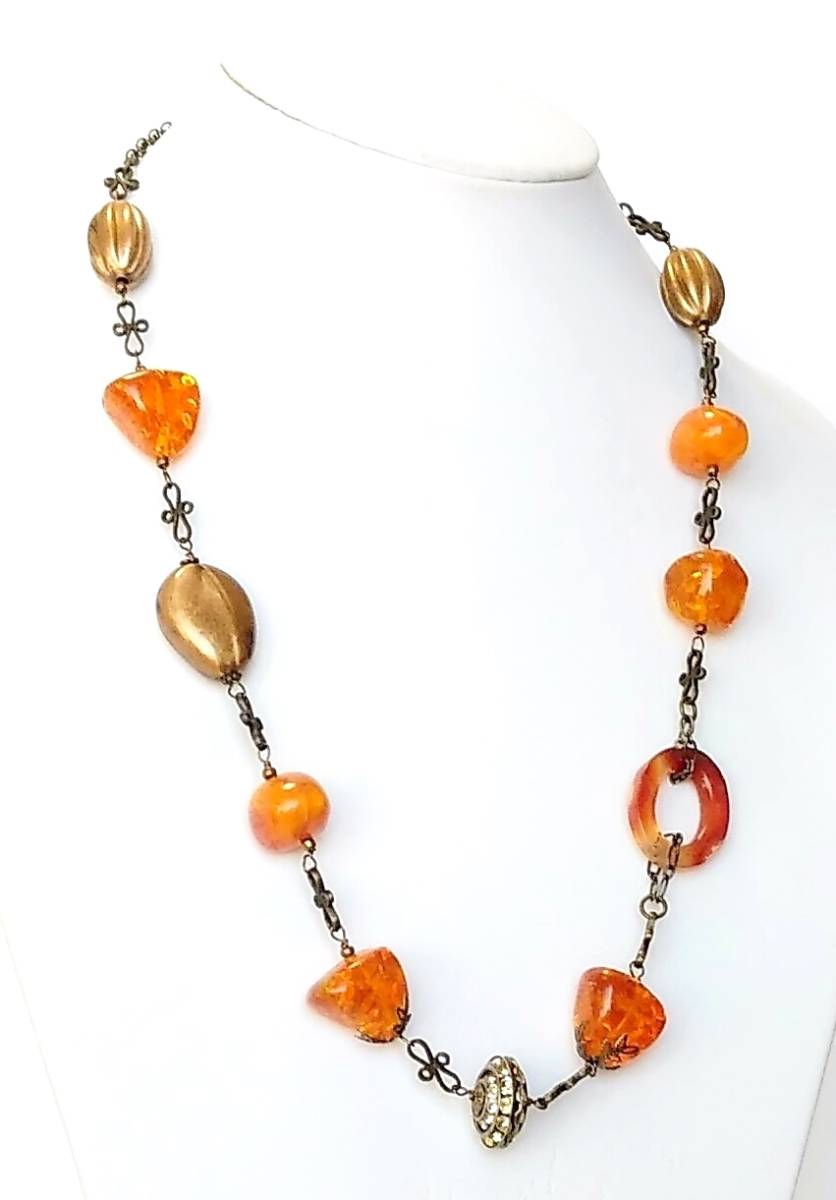 ハンドメイド(手作り)の1点物です。 カーネリアンとアンバーカラーのドイツビーズやアンティークビーズを落ち着いたトーンで組み合わせたロングネックレス。 様々な型や素材がミックスされていますが、統一されたテイストでアンティークなイメージに仕上げました。 又、中心のメタルビーズが動くたびにきらきら輝いてとても素敵です。 問屋を通さず、メーカー直結ならではのプライスでご提供いたします。 絶好のチャンスをお見逃しなく! 是非おすすめします。 素 材:カーネリアン・ドイツビーズ・アンティークビーズ チェーン・金古美 サイズ:長さ・60cm cs-267 市場価格の5割引でご奉仕いたします。 無料でラッピング致します。ご希望の方はその旨お申し出下さい。 | |||