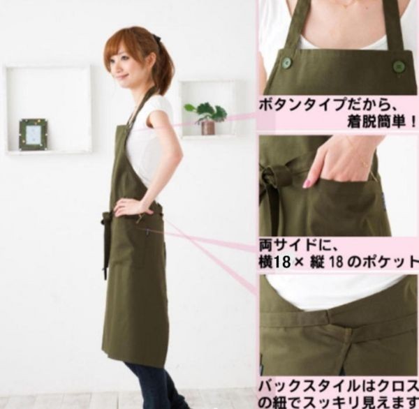 この商品は、首掛け、前結びタイプのエプロンです。ポケットが二つ付いていて、ペン、ハンカチ、ティッシュなどの小物入れにも便利です。