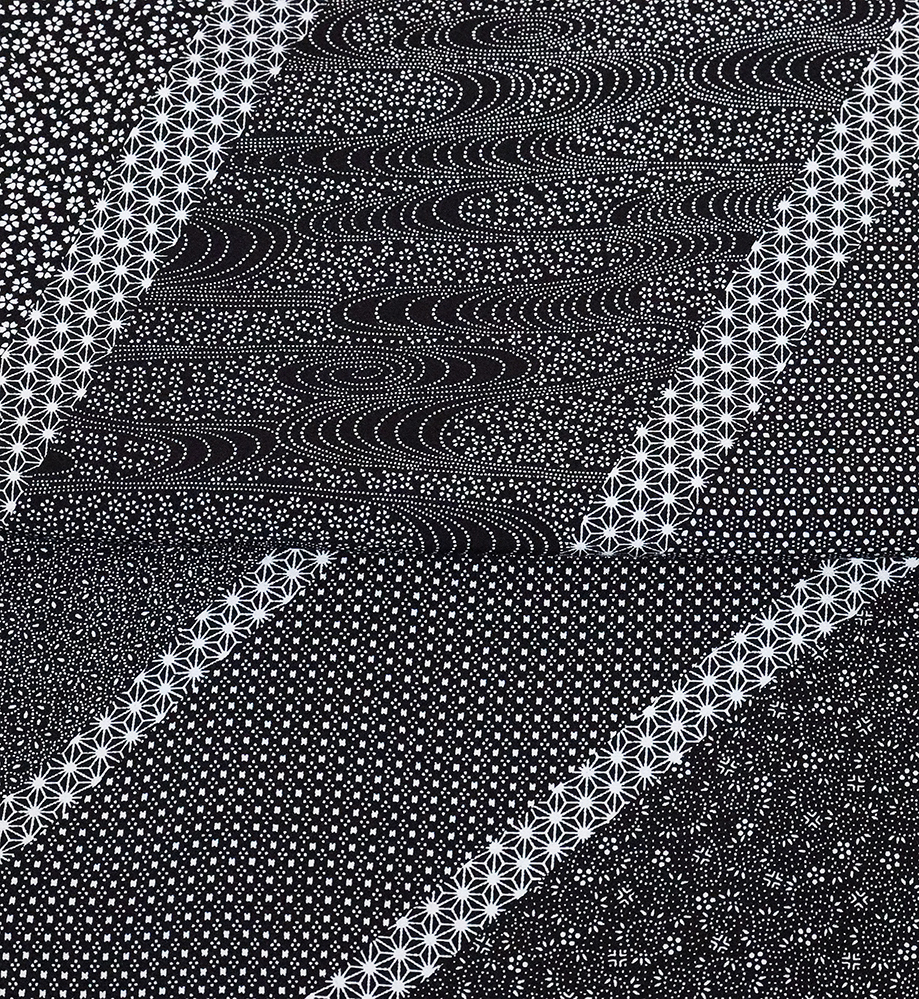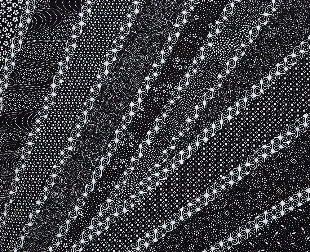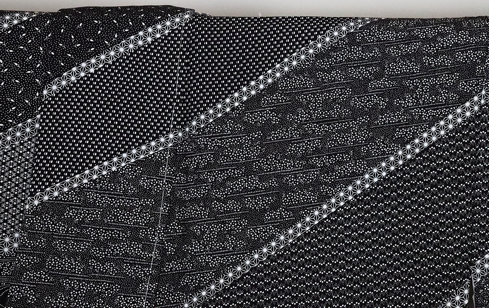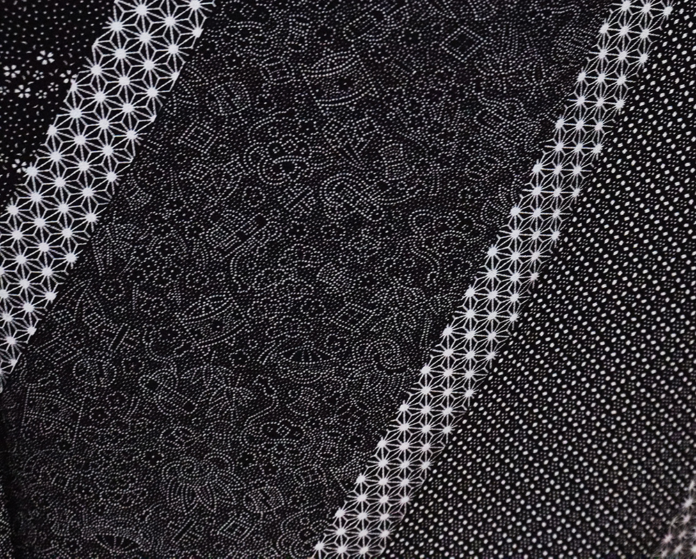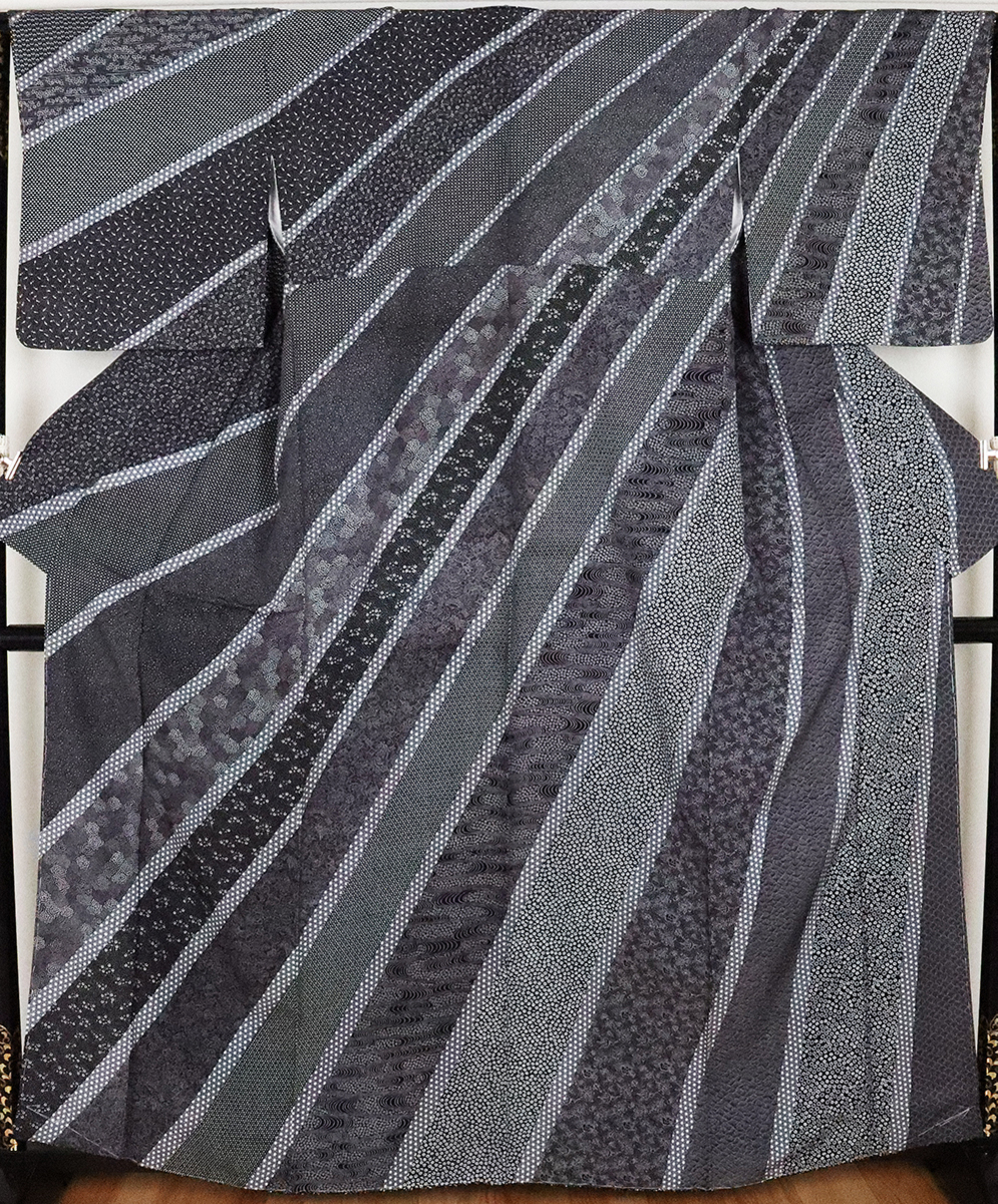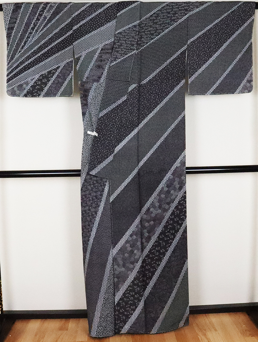 | 訪問着 袷 丹後縮緬地 江戸文様訪問着 黒地小花紋様斜め縞 唐辛子・菊・桜・麻の葉・流水・菊菱・宝尽くし 169 広襟 新品 仕付け付き | |