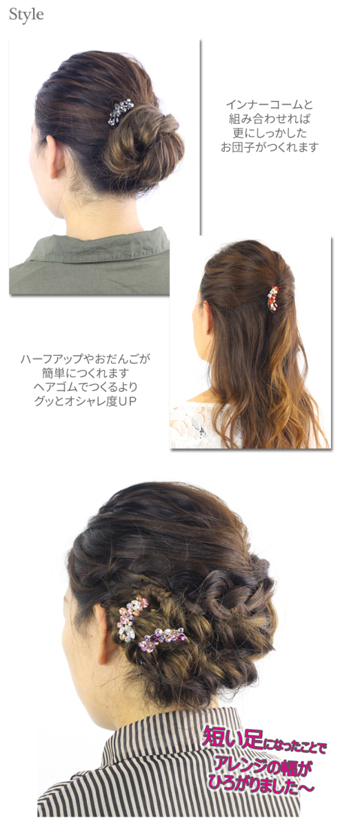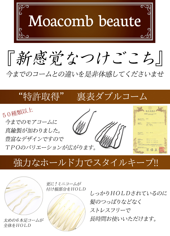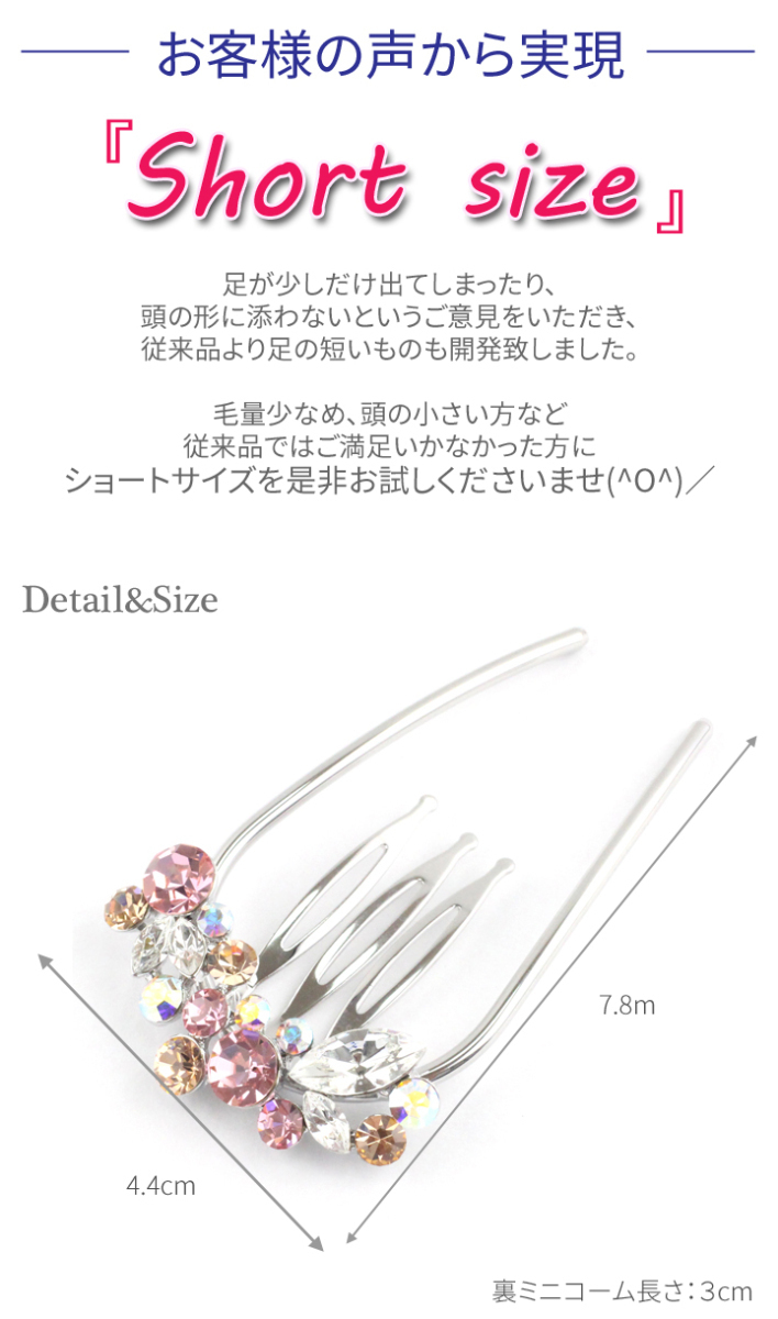| 商品説明 | お客様の声から実現!『ショートサイズ』 足が少しだけ出てしまったり、頭の形に添わないというご意見をいただき、 従来品より足の短いものも開発致しました。 毛量少なめの方や頭の小さい方など従来品ではご満足いかなかった方に ショートサイズを是非お試しいただきたいです(^O^)/ ◆日本特許取得済◆ 夜会巻きコームに新革命!!業界初の表裏ダブルコームでキープ力抜群!! 太めの長い2本足コームが全体をHOLDし、短いコームが付け根部分をHOLD コームをつけたときの嫌なツッパリ感などないため、長時間付けて居られる優れものです。 大粒のクリスタルやストーンが華やかなお席にぴったり♪重ね付けで更にオシャレ度UP!! |