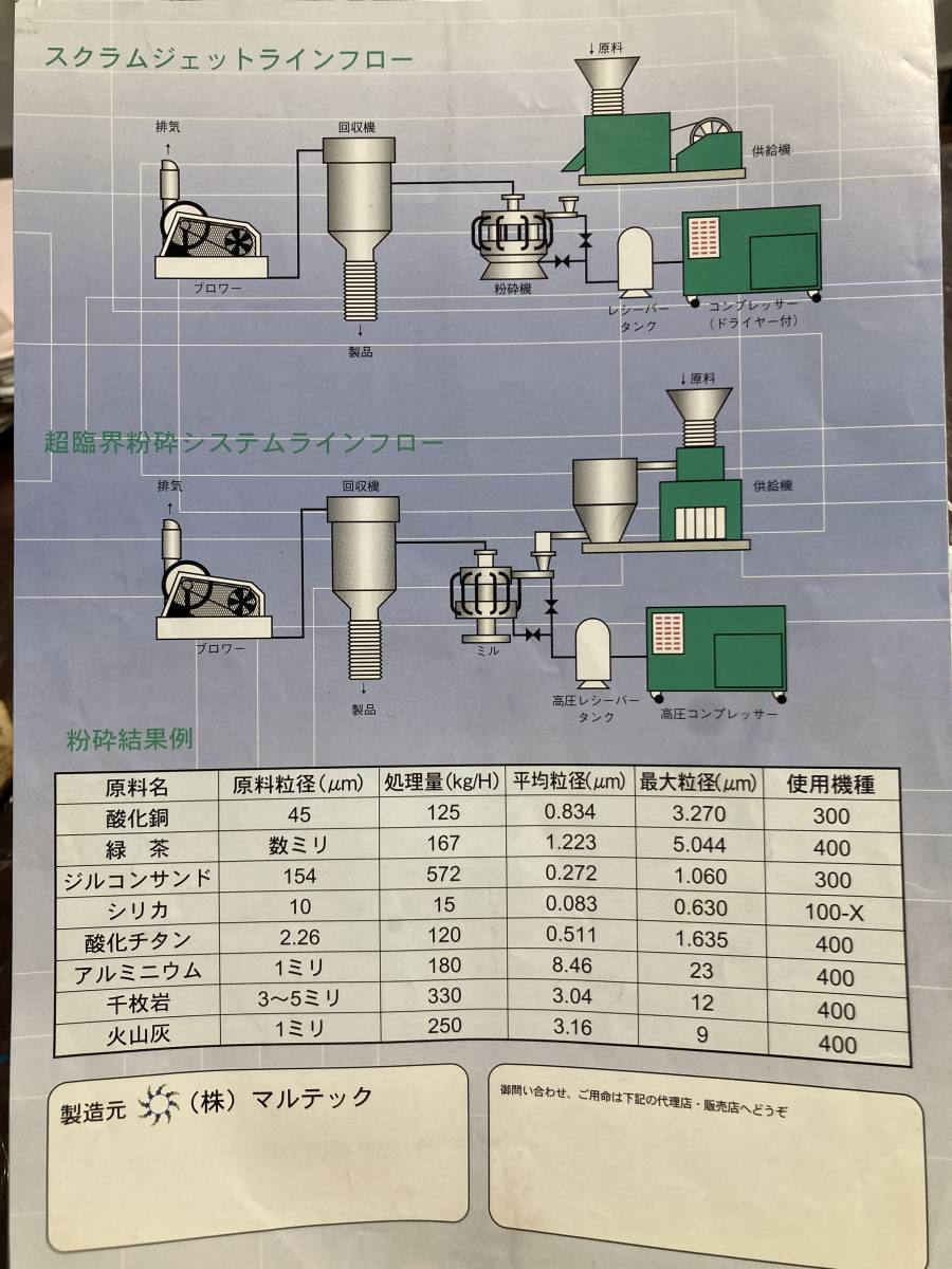 「ミクロの超微粉末を大量生産できたら…。」その思いを形にしてくれるのが「ジェットミル」です。圧縮空気で特定のモノを数μmの微粉末にすることができます。約23年前に購入し、8年ほど使用してから使わないまま保管していました。総運転時間は約60時間です。「タモギタケ」という食用キノコを粉砕しておりました。それ以外には一切使用しておりません。粉砕機内部の様子をYouTubeにアップしました。下のリンクからご確認くださいませ。
