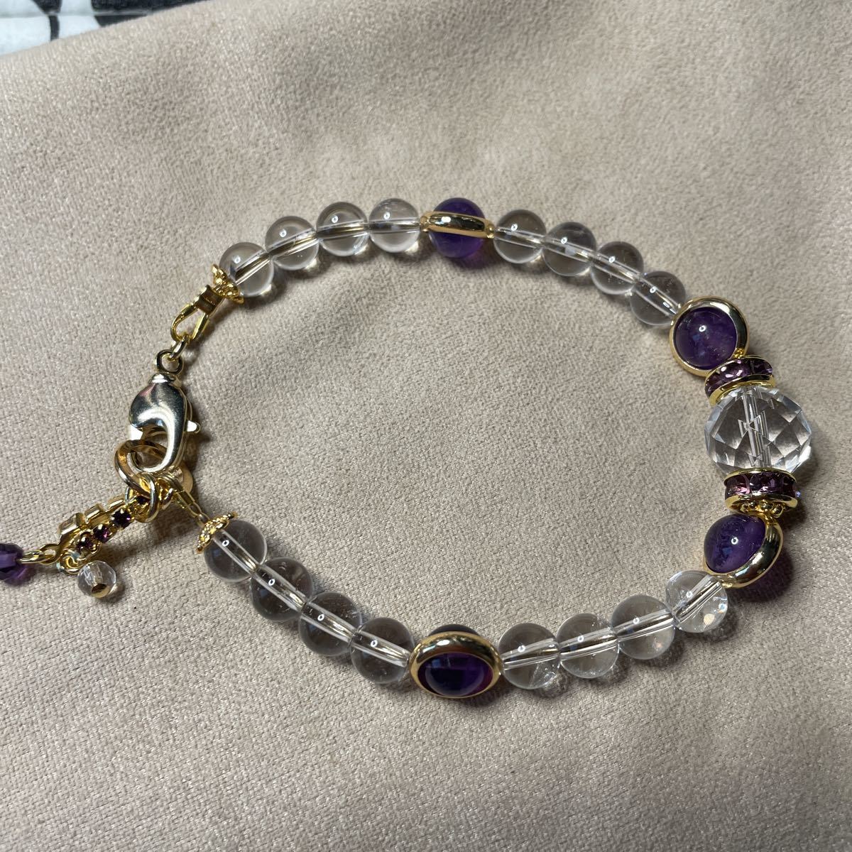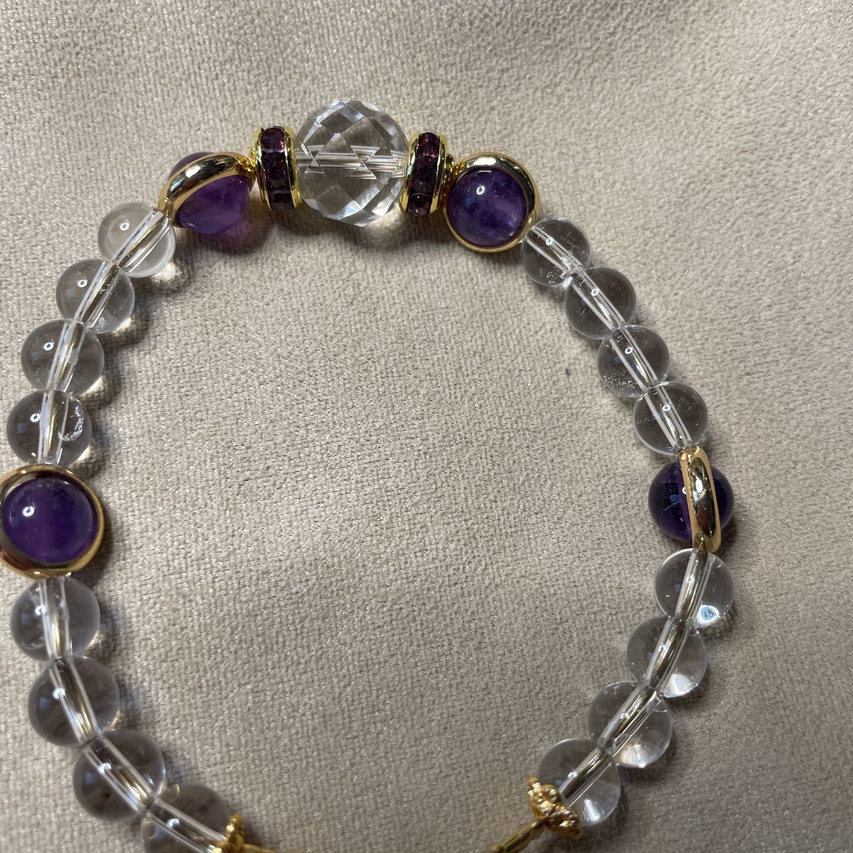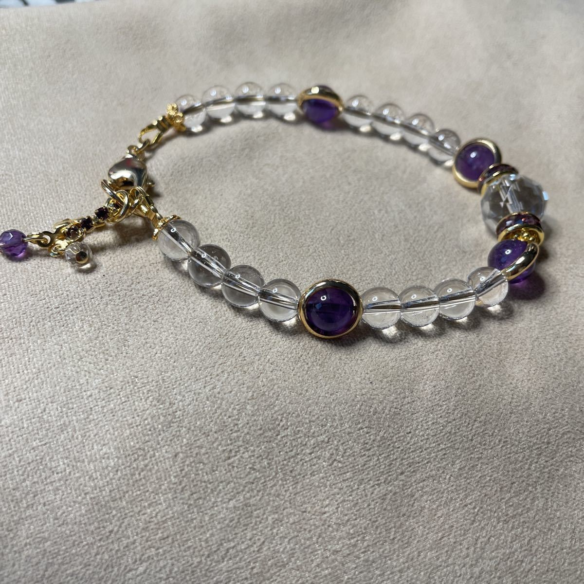 7ミリの水晶と8ミリのアメジスト使用しております。真ん中は12ミリのカット水晶使用しております。リングパーツにアメジストを納めてみました。キラキラととても素敵です。留め金は回転式ですのでつけ外ししやすいです。スワロフスキーダイヤレーンがとても綺麗です。サイズ変更可能ですが現状は女性には少し大きめの長さ20センチくらいで作ってあります。