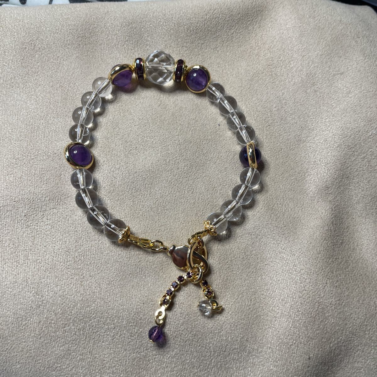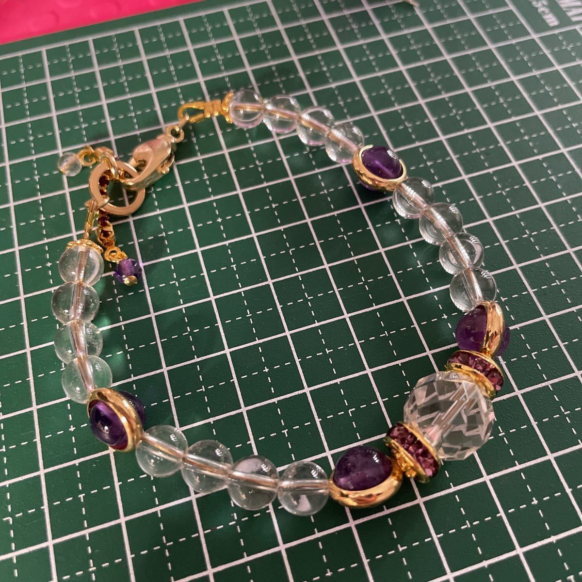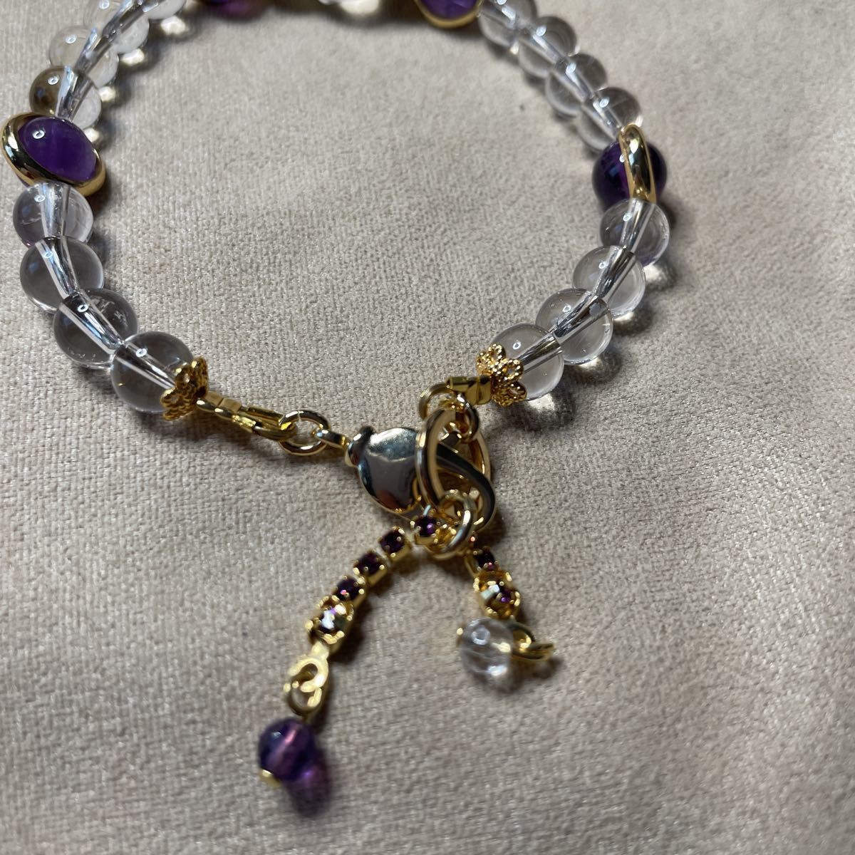 7ミリの水晶と8ミリのアメジスト使用しております。真ん中は12ミリのカット水晶使用しております。リングパーツにアメジストを納めてみました。キラキラととても素敵です。留め金は回転式ですのでつけ外ししやすいです。スワロフスキーダイヤレーンがとても綺麗です。サイズ変更可能ですが現状は女性には少し大きめの長さ20センチくらいで作ってあります。