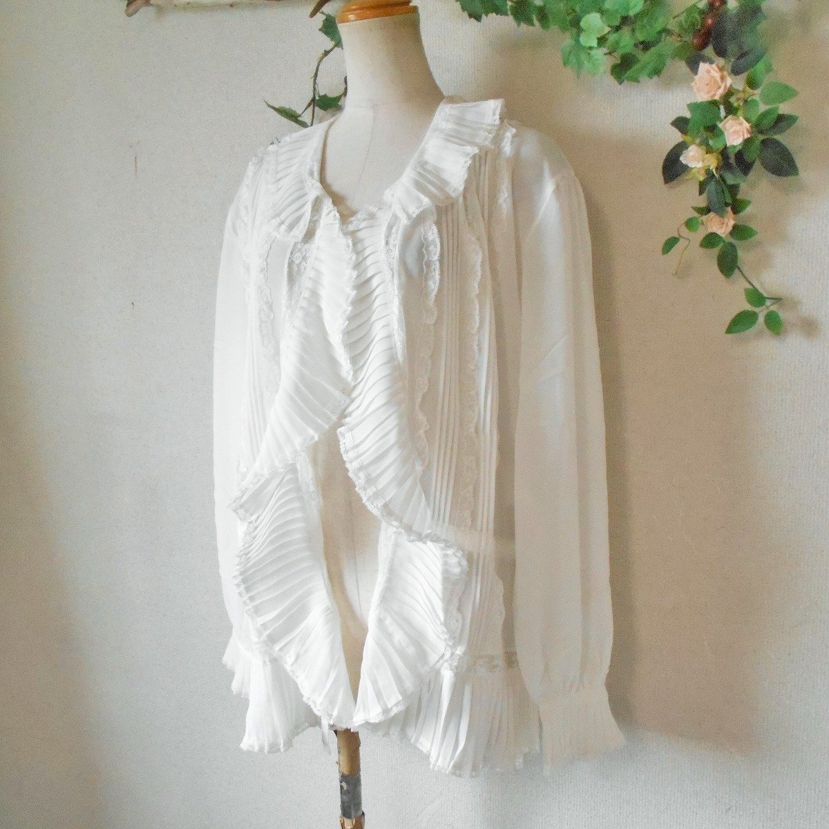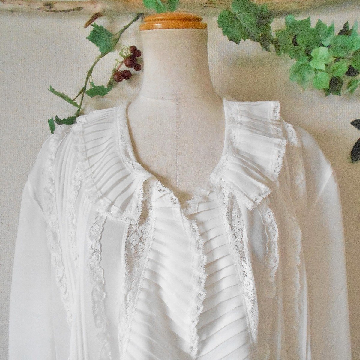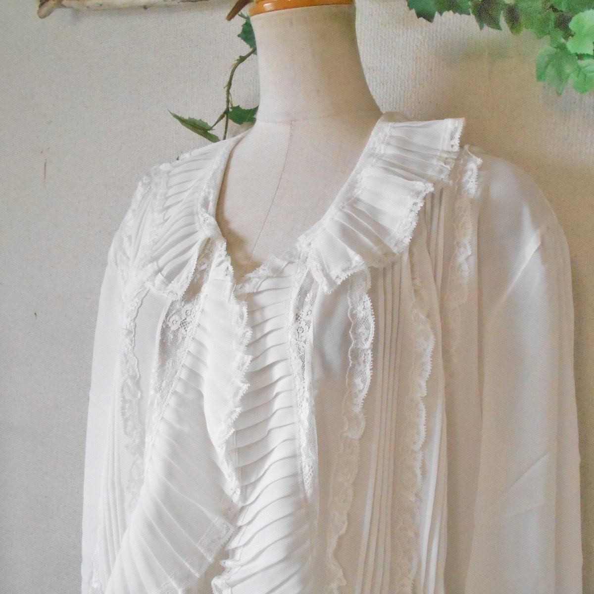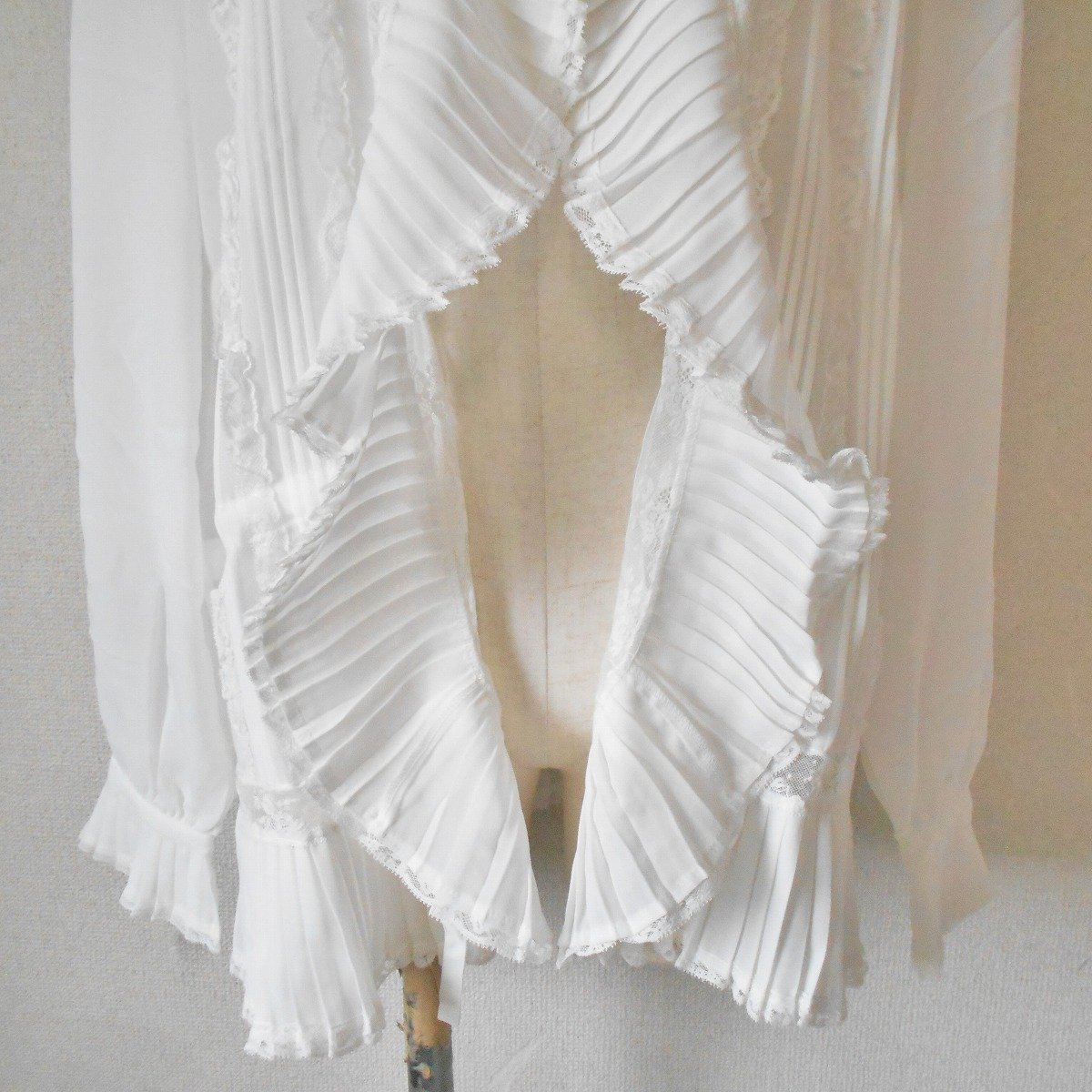 【ポイント】インゲボルグのオーバーブラウスになります。お色は白色で、縁取りはプリーツとフランスレースが使用され、前身頃にはピンタックとレースが使用された、とっても素敵な一着です。