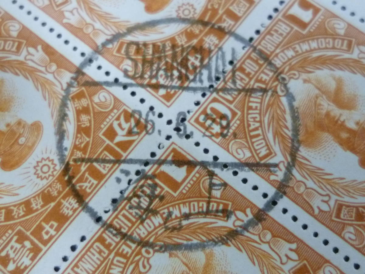 22 P 旧中国 中華民国切手 1929年 #341 政府統一 介石 1c 田型 耳紙付 印影大美消 消印「上海」