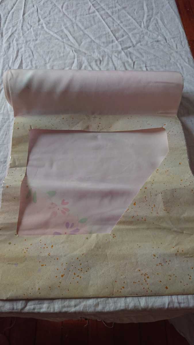 長襦袢用の反物です。色は薄ピンクで、一部に花柄です。13.5mです。未使用品ですが、一度人が手にしたものなので中古品とお考え下さい。
