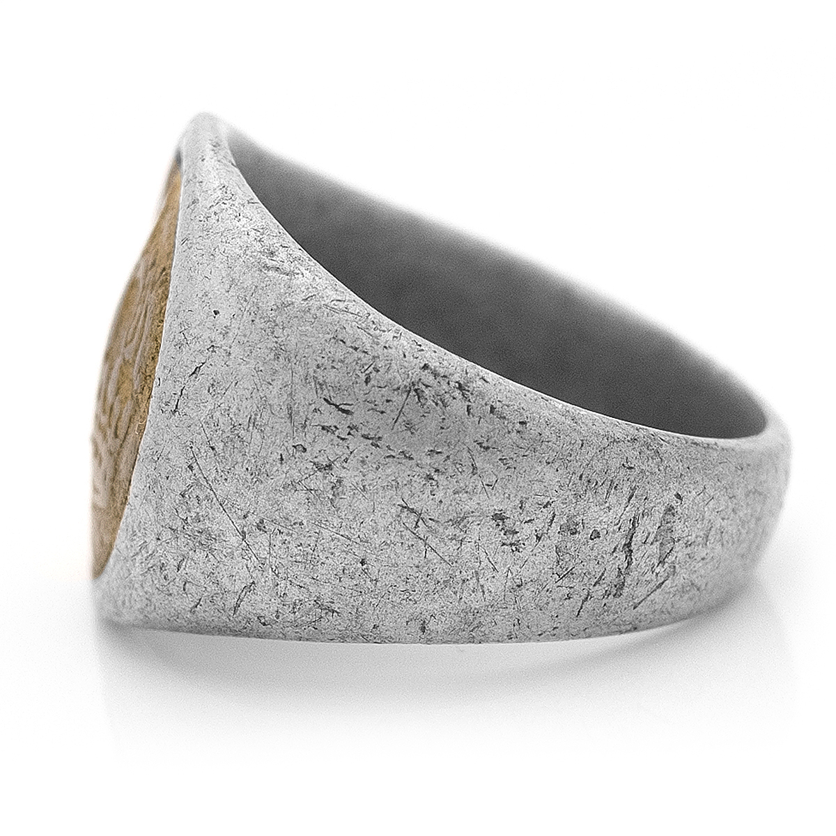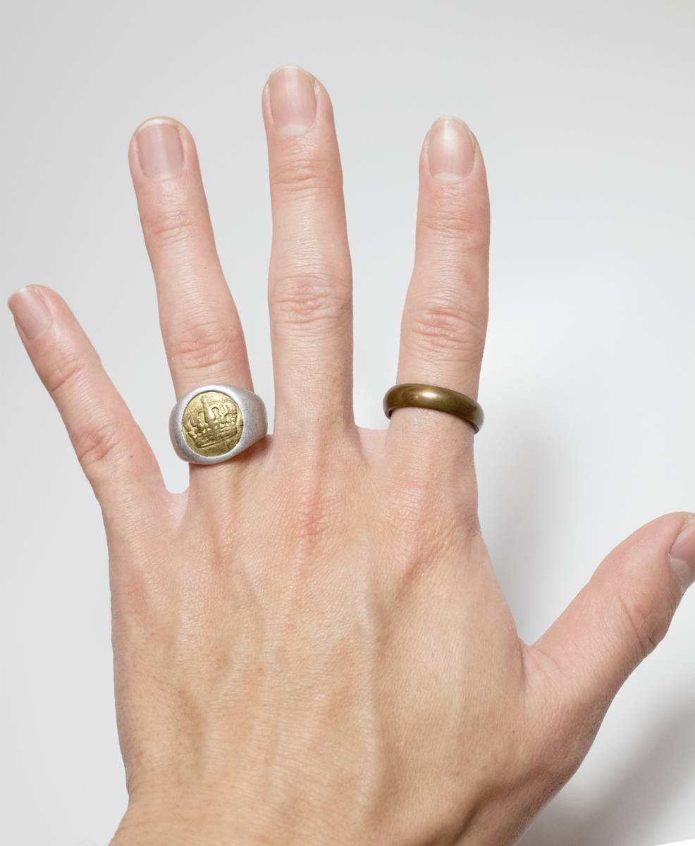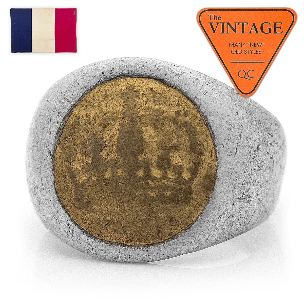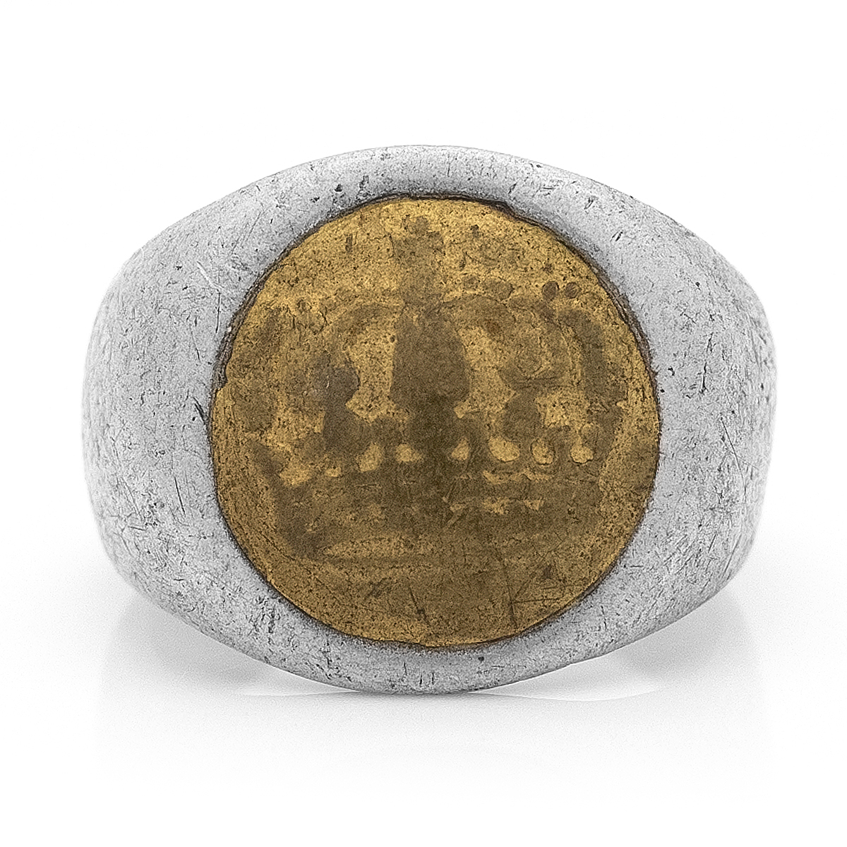 [希少 1910's WWI イギリス ヴィンテージ ミリタリー 王冠 シガー バンド リング アンティーク 14号 太め 真鍮 アルミ シルバー ゴールド 88] 存在感のある太めのシガーバンドリング。1910年代第一次世界大戦期当時のイギリス軍のANTIQUEアートリング。 中央には真鍮製の渋さの際立つゴールドトーン。 そして経年変化により角が取れスムースな陰影を映し出す、イギリスならではのインペリアル・クラウンの彫金。 当時の物資状況によりアルミニウムをメイン素材として作られているため、存在感はありながらもギラギラとしたいやらしさのない、マットな質感。 また重厚感のある見た目とは裏腹に非常に軽いつけ心地で長時間着用していてもストレスフリー。 時を経て完成した燻んだカラーや独特の素材感、スムースな手触りはアンティークだからこそ。 MARTIN MARGIELA(メゾン マルジェラ)などがサンプリングソースとしても使用するのも頷ける、唯一無二の秀逸デザインリング。 モード系だけでなくNigel Cabourn(ナイジェルケーボン)等のミリタリー ファッション好きにもおすすめ。 ・コンディション