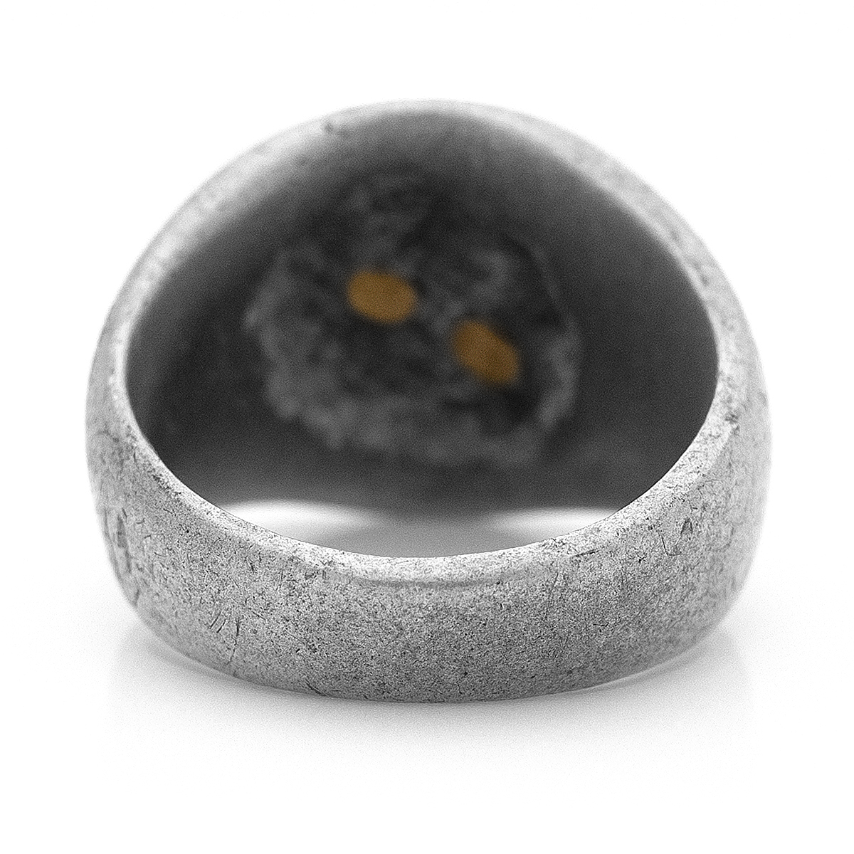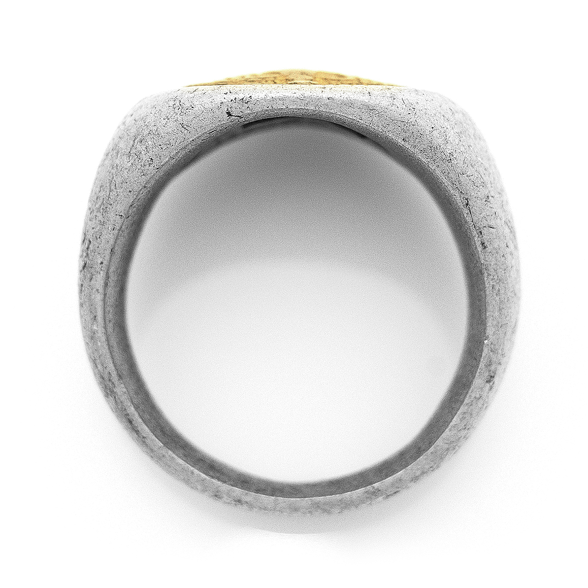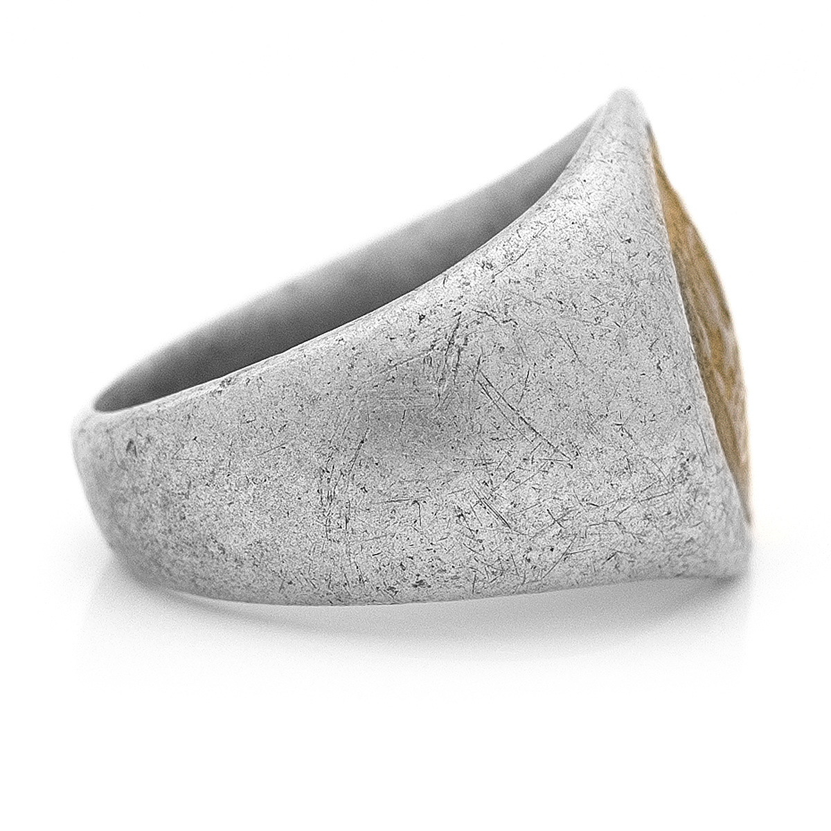 [希少 1910's WWI イギリス ヴィンテージ ミリタリー 王冠 シガー バンド リング アンティーク 14号 太め 真鍮 アルミ シルバー ゴールド 88] 存在感のある太めのシガーバンドリング。1910年代第一次世界大戦期当時のイギリス軍のANTIQUEアートリング。 中央には真鍮製の渋さの際立つゴールドトーン。 そして経年変化により角が取れスムースな陰影を映し出す、イギリスならではのインペリアル・クラウンの彫金。 当時の物資状況によりアルミニウムをメイン素材として作られているため、存在感はありながらもギラギラとしたいやらしさのない、マットな質感。 また重厚感のある見た目とは裏腹に非常に軽いつけ心地で長時間着用していてもストレスフリー。 時を経て完成した燻んだカラーや独特の素材感、スムースな手触りはアンティークだからこそ。 MARTIN MARGIELA(メゾン マルジェラ)などがサンプリングソースとしても使用するのも頷ける、唯一無二の秀逸デザインリング。 モード系だけでなくNigel Cabourn(ナイジェルケーボン)等のミリタリー ファッション好きにもおすすめ。 ・コンディション