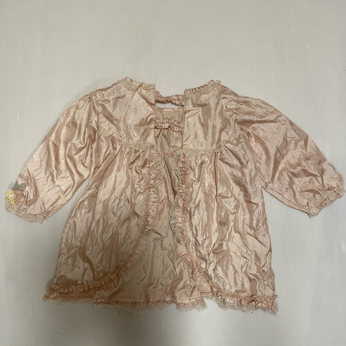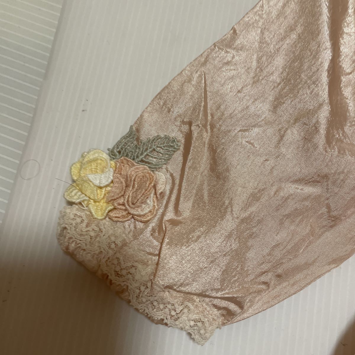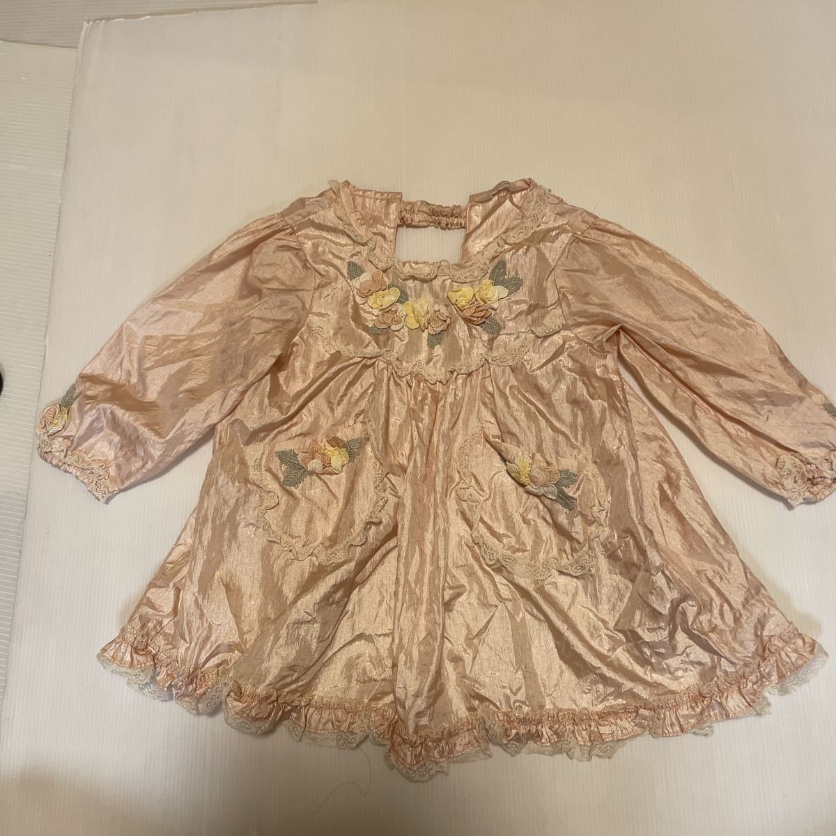 薄ピンクのサテンにレースとお花のモチーフがついた豪華なエプロンです。 結婚式やパーティーに!