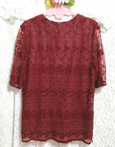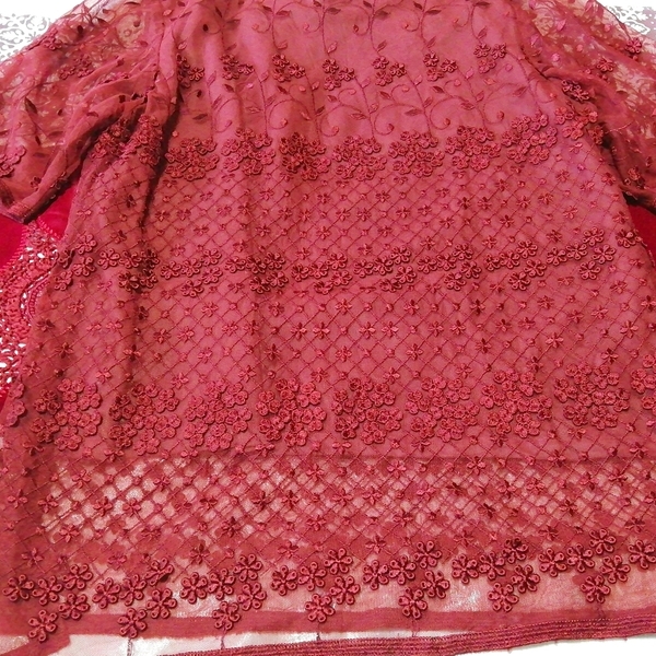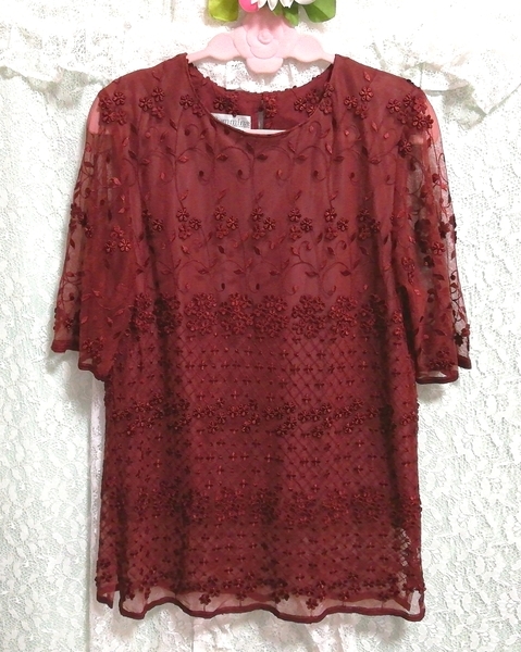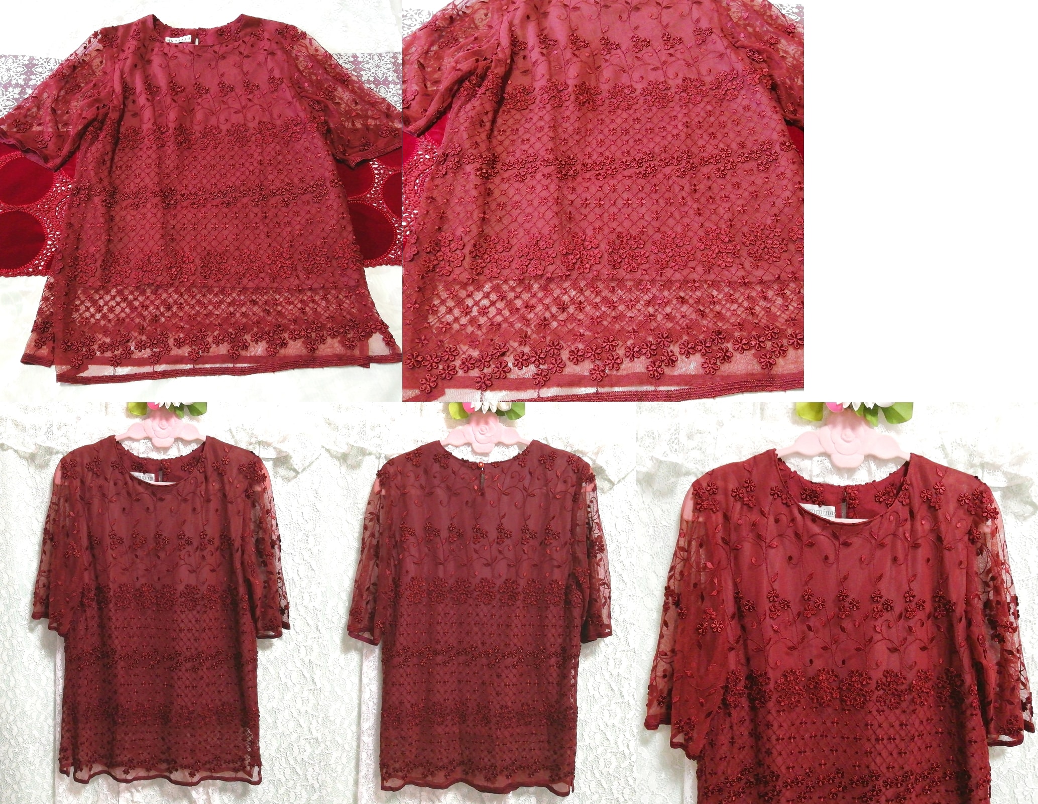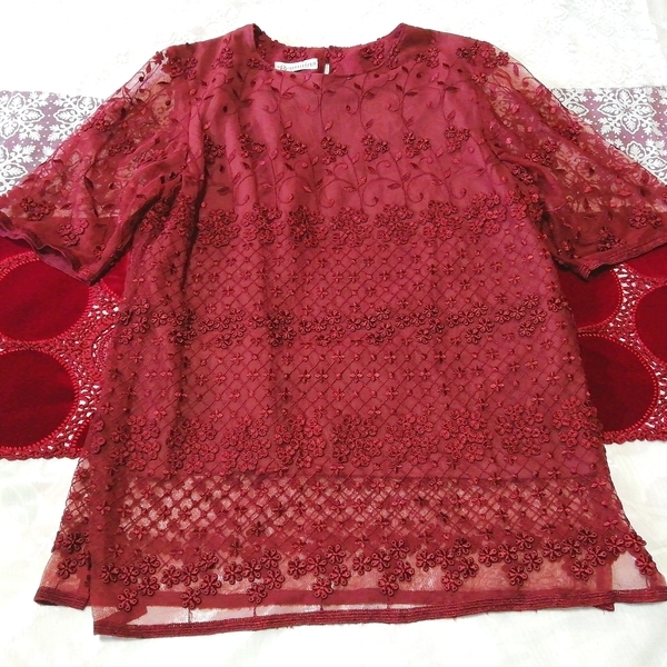 赤ワインレッド花柄レース半袖チュニック ネグリジェ ナイトウェア ワンピース Red wine red floral lace tunic negligee dress