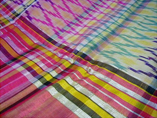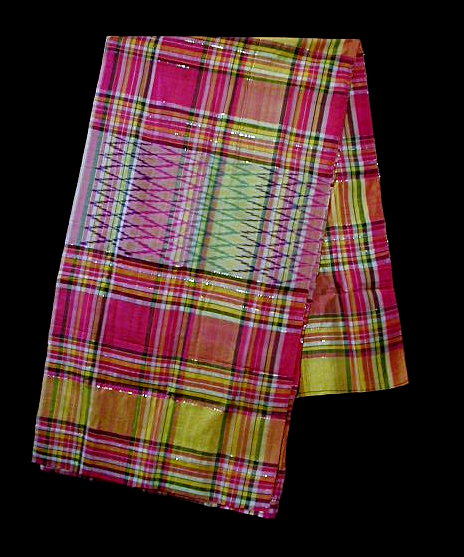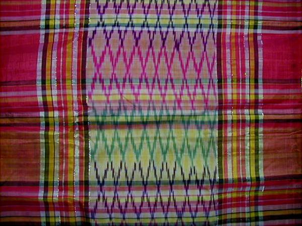 通称「Kain Bugis」で知られる、南スラウェシに暮らすブギス人の伝統絹織物。これはBone県で作られた製品です。Kain Bugisにはかすり織りのものと、紋織りと2つの種類があります。これは格子柄に縫い取り織り模様入りの豪華なタイプ。織り機に単色の絹糸をかけ、緯糸でジグザグ模様や花模様を織り、さらに縫い取り織りで花模様を入れます。Kain Bugisの生産中心地はSingkangやRapangで、このRapangの町近くに日本の紡績工場があり日本の蚕のたねを輸入してまゆを採っています。安いものは中国製の絹糸を使って織られますが、この品物は現地生産の糸を使用しています。サイズは約53cm X 360cm。。細長いので浴衣の帯などにに使ってもすてきです。