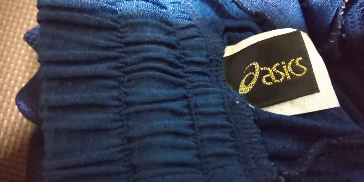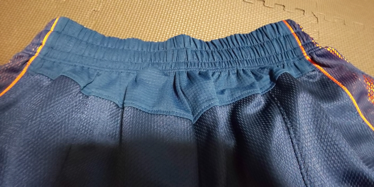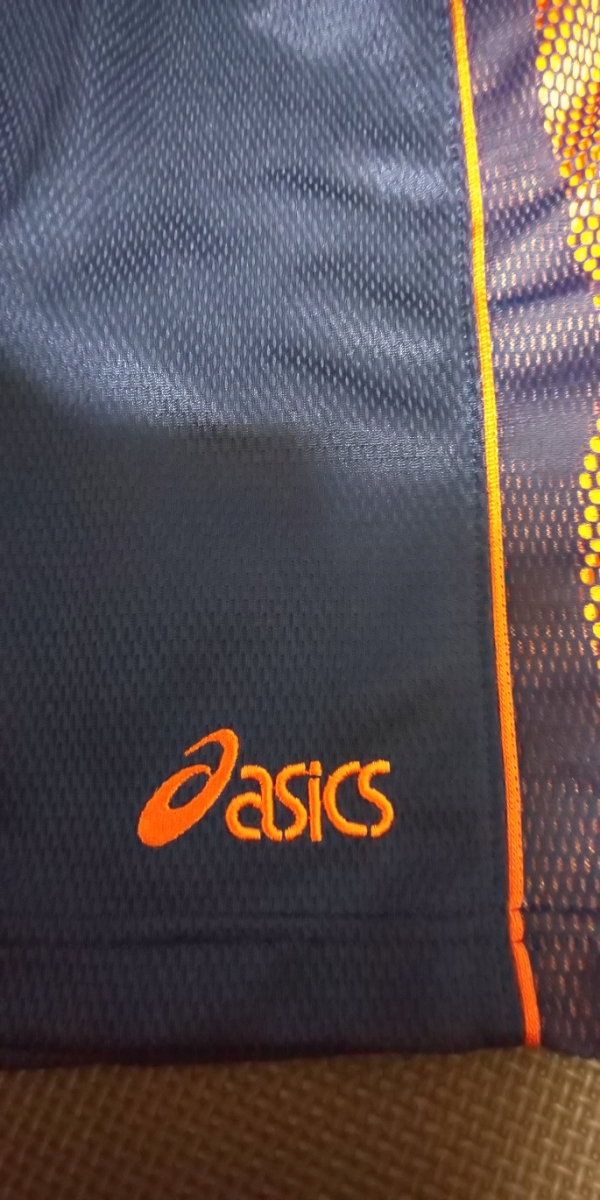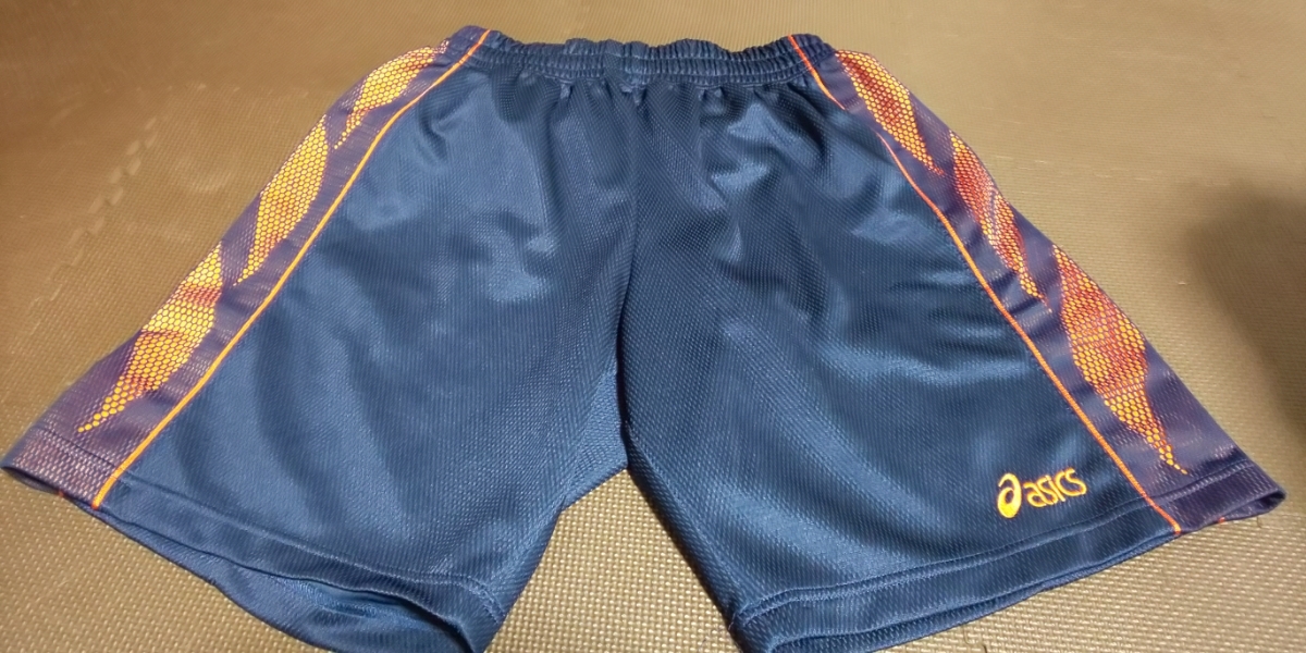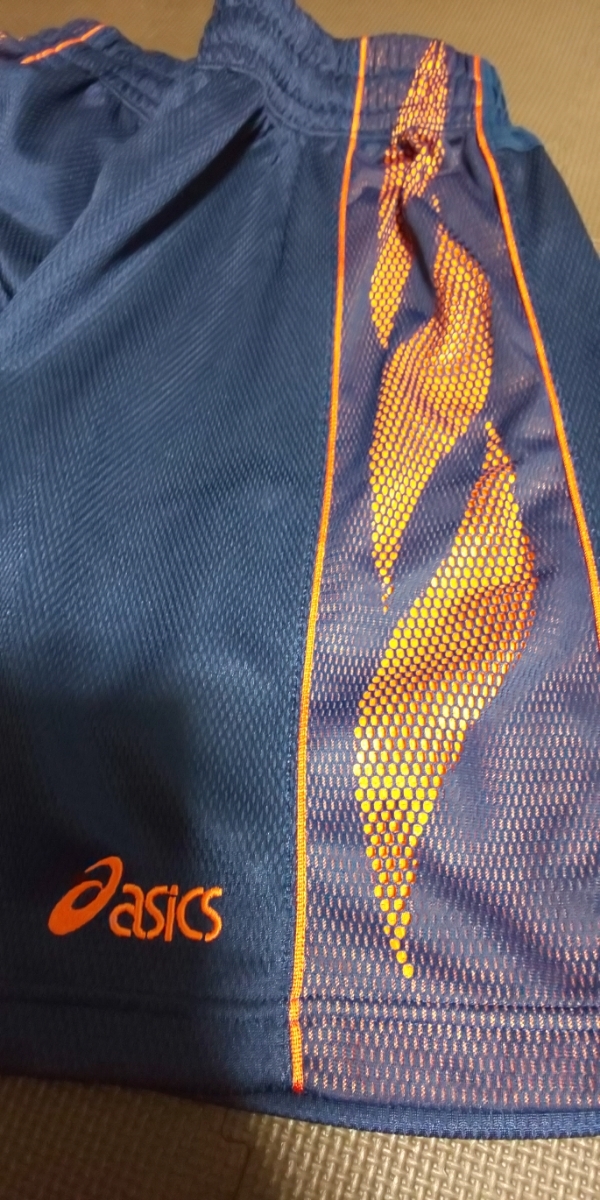 美品ASICS濃紺、オレンジメッシュ、ストレッチハーフパンツ