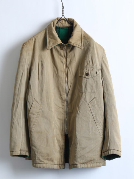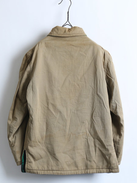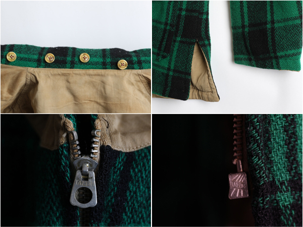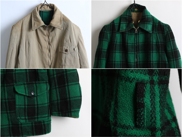チペワはウィスコンシン州にあるチペワフォールズに拠点を 置いたChippewa Woolen Millsで製作されていたブランドです。 希少サイズのS程で袖がやや短めですが着た時のシルエットが 非常に細身で綺麗です。(実寸をご確認下さい。) 表は目を惹くグリーンとブラックのチェックのウール地を使用し 裾サイドにスナップ・フラップポケット付き、 裏はワークジャケットを思わせるルックスのコットンツイル地、 胸のスナップ・フラップポケットとサイドにスリットポケットが付きます。 襟下にはフード装着用と思われるボタンが付きます。 ジップは扇形TALONのコの字エンドのバタフライタイプが付きます。 元々ウエストベルトが付く仕様ですが、なくなっています。 左ポケット中にタグが付きます。 リバーシブルになっている分、非常に保温性も高く両面に付いたポケットの機能性も高く、 2WAYで違った印象のビンテージ感をを楽しめる一着です。 |