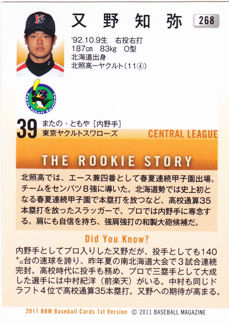 2011BBMベースボールカード1st 268 又野知弥 ヤクルト ルーキー 北海道 北照高校