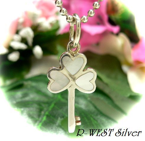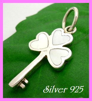 シルバー925銀のシェル貝殻入り クローバー 鍵キー ペンダント/マザーオブパール