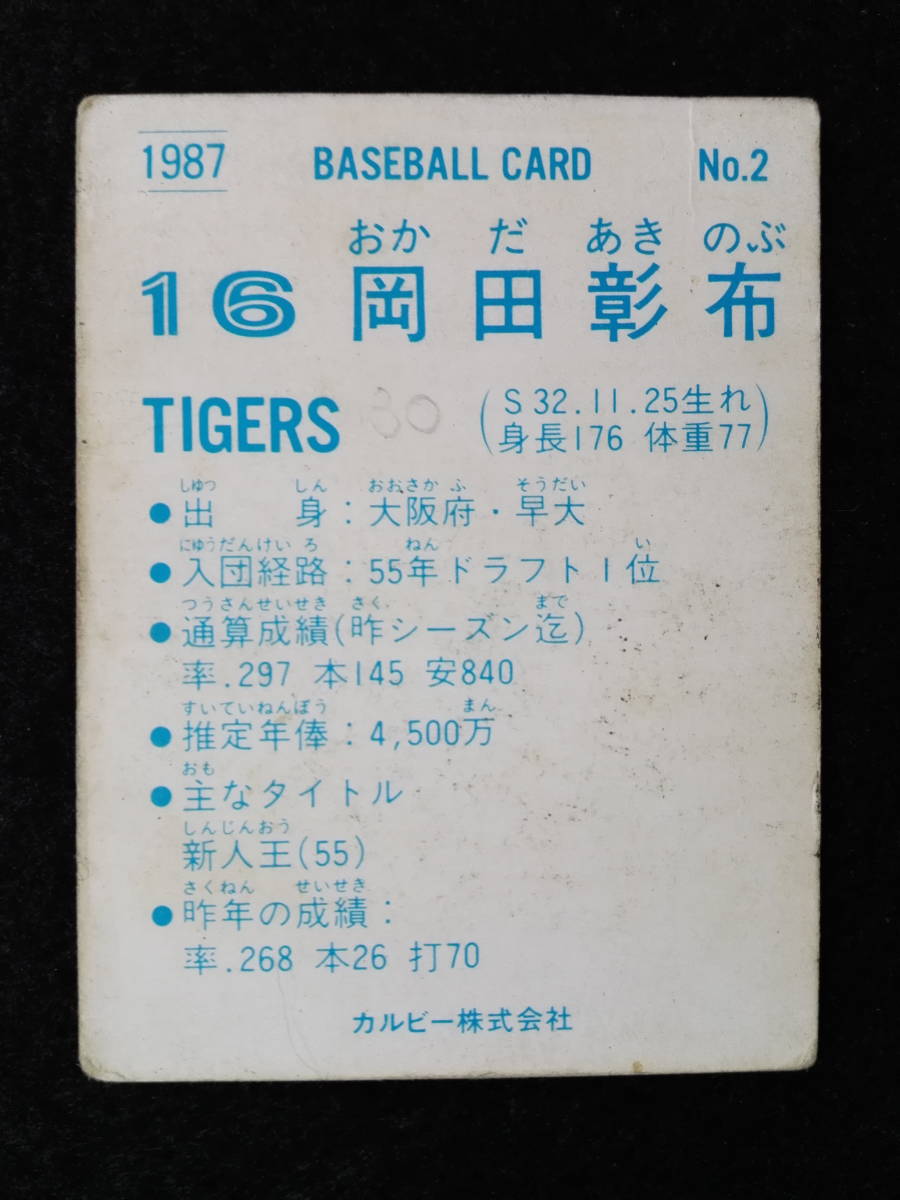 【商品説明】 こちらの商品は、1987年カルビー プロ野球スナックカードになります。 岡田選手です。 経年による汚れ、スレ、シミ、 小傷、色褪せ、端々の破れ等ございます。 神経質な方はご遠慮下さい。 譲り受けたままの状態です。 白く写っているのは、光の反射に よるものです。 発送についてですが、スマートレター、 レターパックライトでの発送を予定しております。 下記の注意事項をご覧になり同意の上の方のみ 入札をお願い致します。 【注意事項】 ※ 落札後のクレームや返品は、お受け致しませんのでご了承下さい。 ※ 落札後48時間以内にご連絡が取れる方のみ入札をお願い致します。取れない場合は、落札者の都合により削除させて頂きます。 ※ 新規の方の入札は、ご連絡されて下さい。入札をお断りさせて頂く場合がございますのでご注意願います。また評価の低い方やマイナスが多い方の入札は、こちらから削除させて頂く場合がございます。 ※ 経年による汚れ、小傷等ございますので細かい所が気になる方は、ご遠慮下さいませ。 ※ 気になる所や疑問点などございましたら必ず入札前に質問メールにてご質問されて下さい。 ※ 質問メールにメールアドレスや電話番号など記載されていた場合は、お答え致しません。(お答えした場合公開される為) ※ 仕事の都合上ご連絡が遅くなる場合がございますのでご了承下さい。