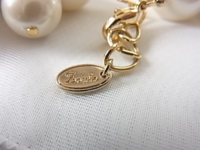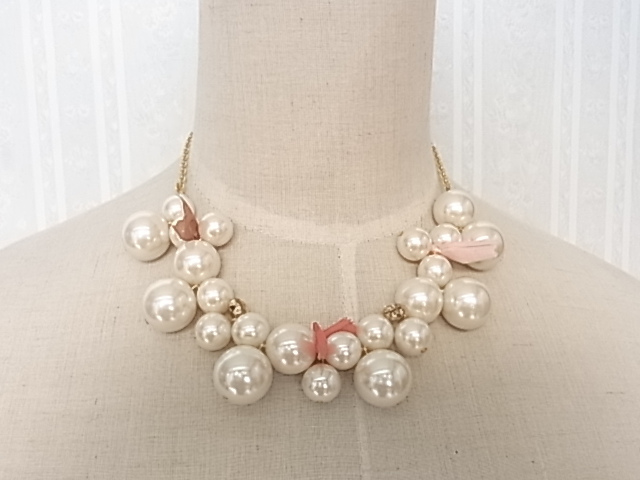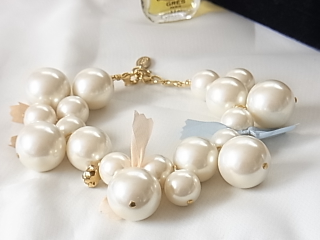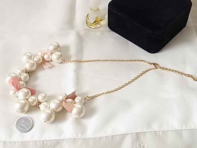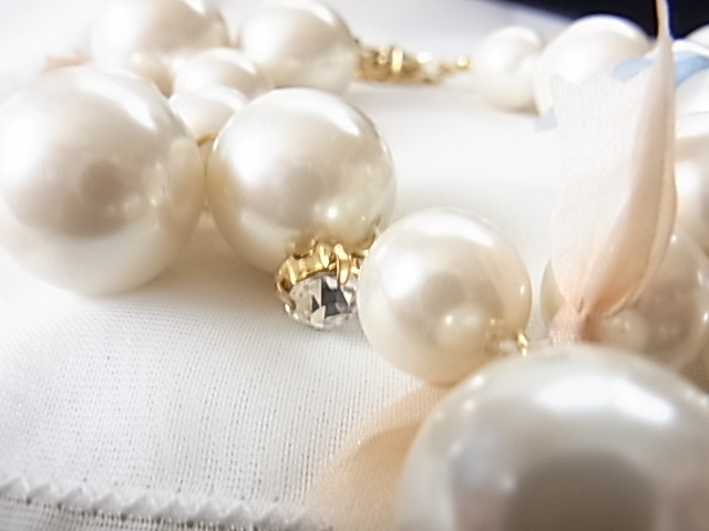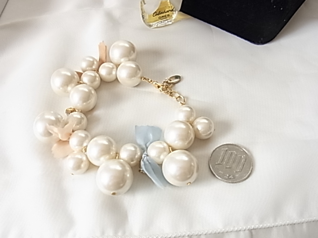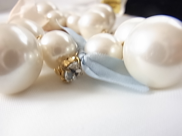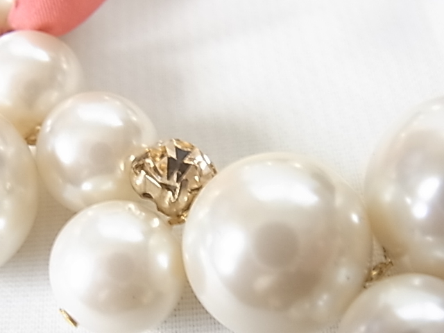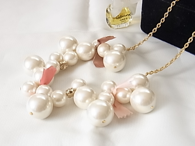 お得な2点セット★パール調ビジューストーンにラインストーンが輝く リボンも付いて可愛さUP ショップ刻印 ネックレスとブレスレット▼