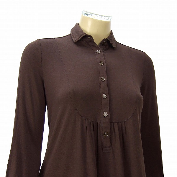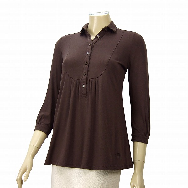 **・゜至福の極柔とろみ7分袖カットソーです。優しい艶感のある茶系ストレッチ生地×衿裏とパイピングはノバチェック柄×左裾ホースマーク刺繍入り×胸元&袖口はロゴボタン留!!軽いパフスリーブ×ヨーク切り替えギャザー入り&背面タック入りで綺麗なドレープを描くややロング丈の上級7分袖カットソーです。*:.。