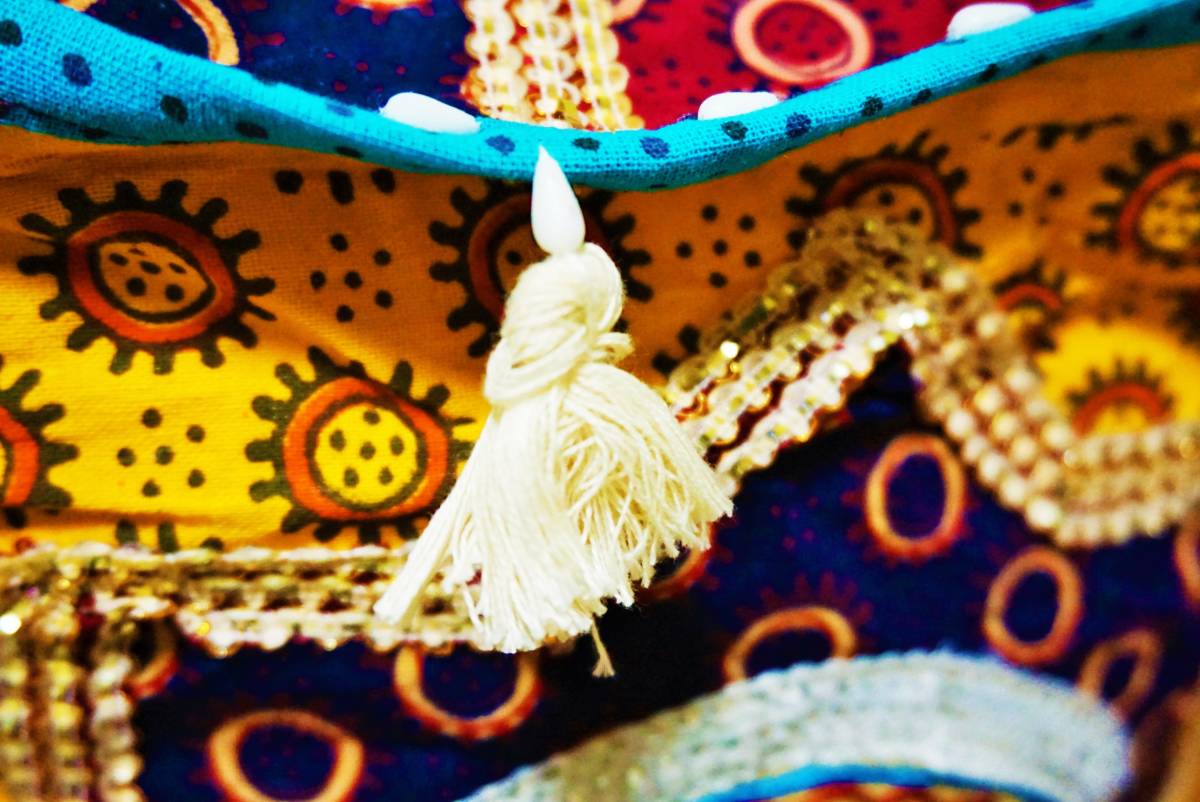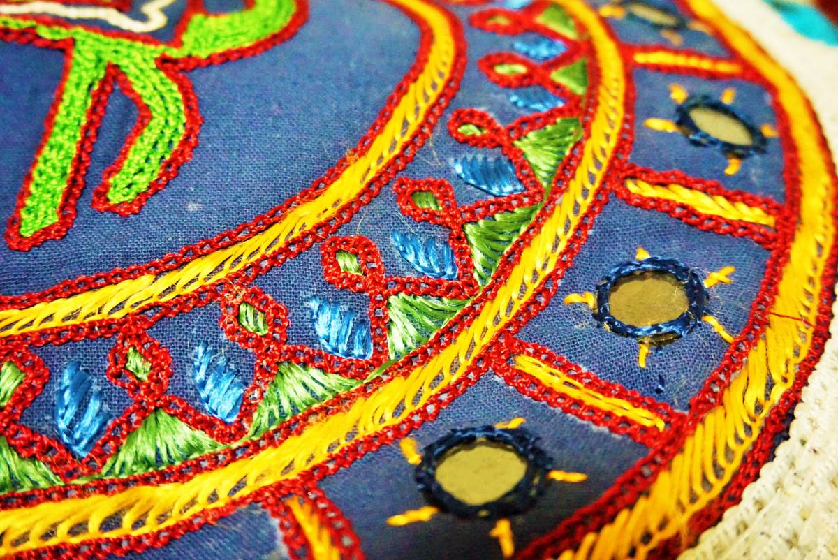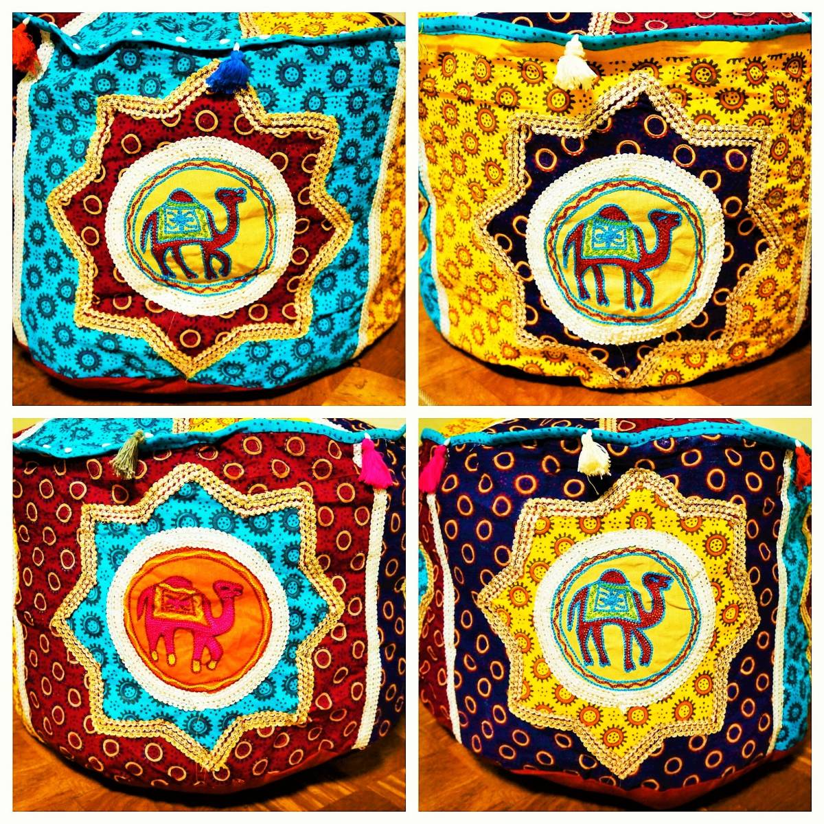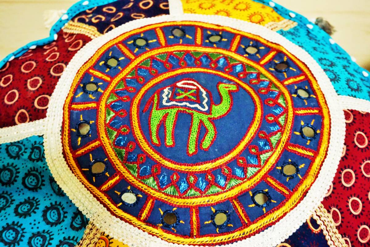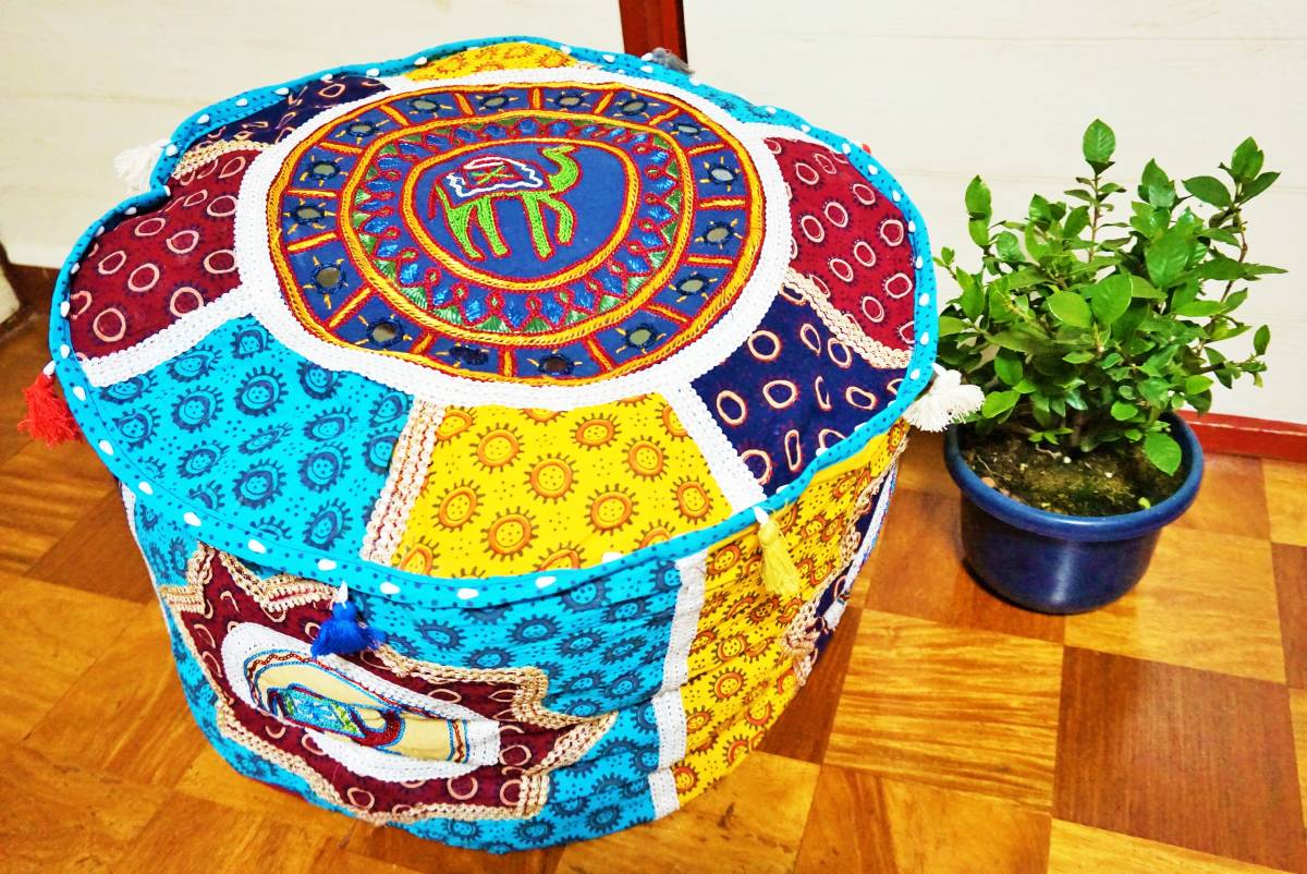 たくさんのエスニック布や刺繍、ミラーワークを施した贅沢なハンドメイドオットマンは、中東、アジアで日常的に使われる、円柱や立方体の形をしたクッションの事を言います