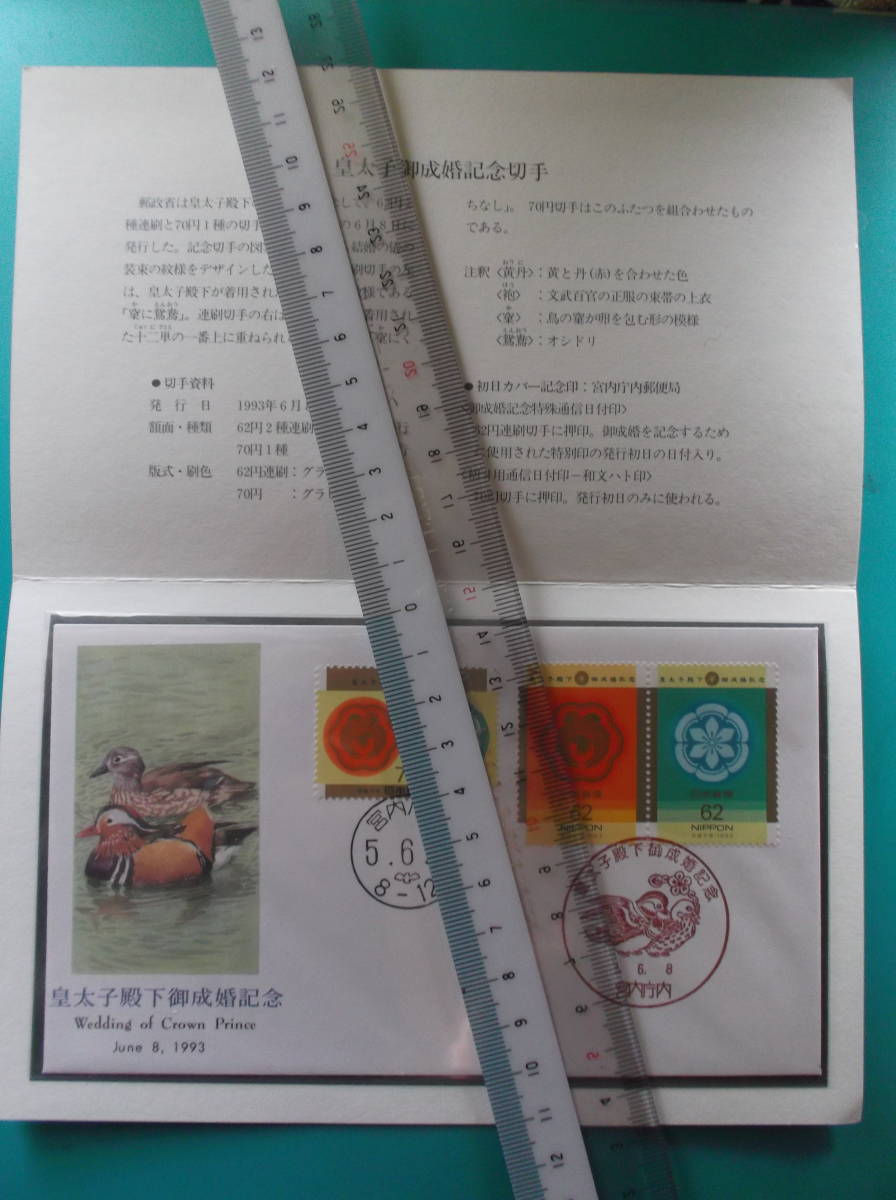 初日印◆FDC◆ 皇太子殿下御成婚記念初日カバー 郵趣サービス 平成5年 6月8日 宮内庁内消印 に鴛鴦 にくちなし